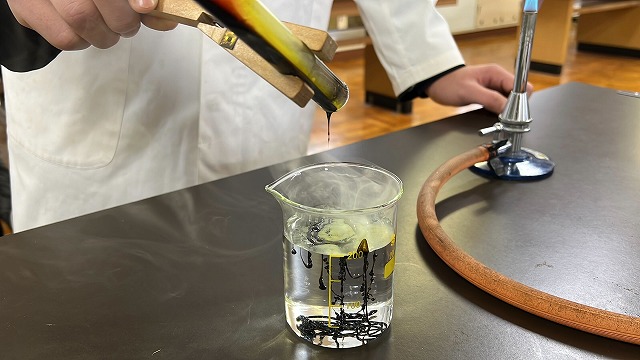 附属中NEWS3年生の理科の授業で、高校化学基礎の内容である「同素体」の実験を行いました。斜方硫黄・単斜硫黄・ゴム状硫黄を実際に作製・観察し、同じ元素であっても原子の結びつき方(分子構造)が異なることで性質が大きく変化することを確認しました。