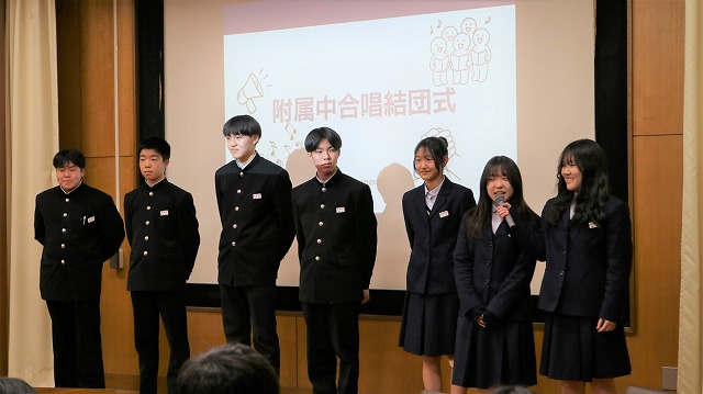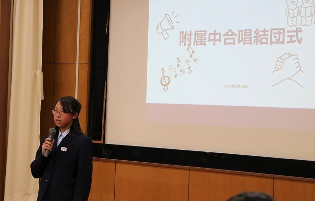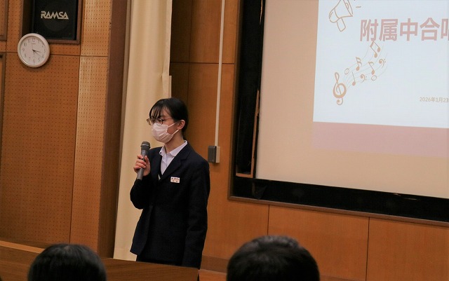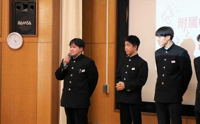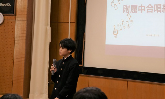全校合唱練習を牽引するパートリーダーからは、3学年合同で行う合唱にかける思いが語られました。合唱を通して一人一人が自分の力を発揮できるよう引っ張っていきたいという決意や、今の附属中の姿を知ってもらう絶好の機会にしたいという熱い思いが伝えられました。