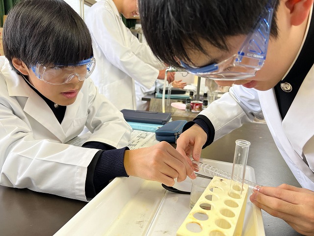 3年生の理科では、身近な合成繊維である 「ナイロン」 の合成実験を行いました。 ジアミン水溶液とジカルボン酸塩化物溶液をそっと重ねると、界面に薄い膜が生まれます。その膜をゆっくり引き上げると、一本の長いナイロン繊維がスーッと伸びていきます。