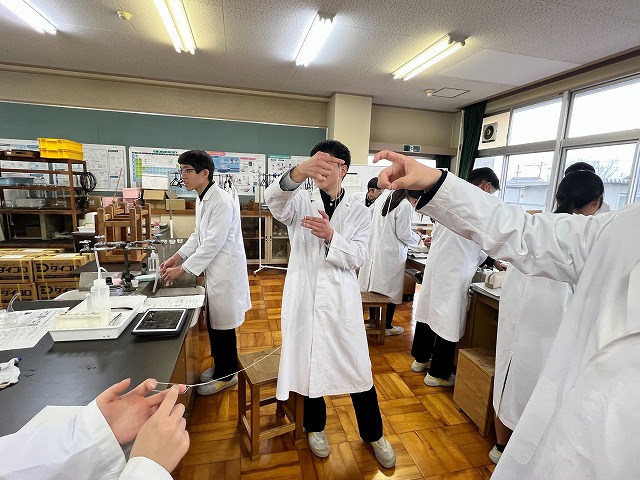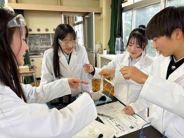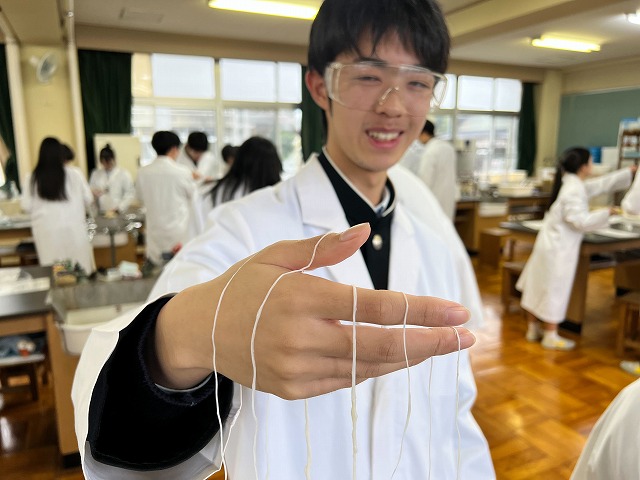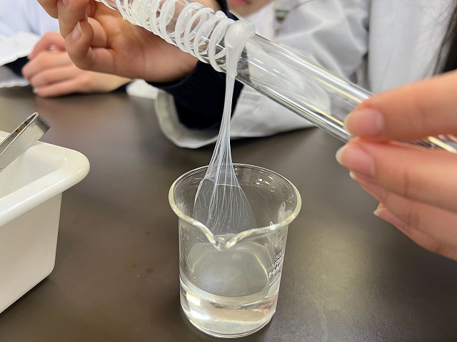 普段は目に見えない「高分子」が、その場で形になっていく様子に、生徒たちは興味津々。
