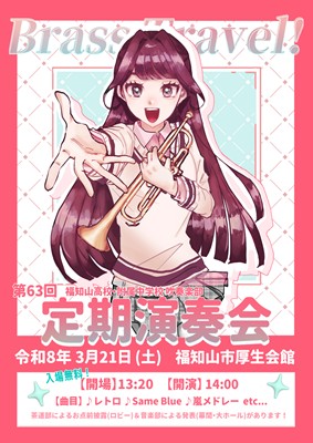 【吹奏楽部】3月21日(土)は定期演奏会♪ 吹奏楽部 Twitter Facebook はてブ Pocket LINE コピー 2026.03.12 3月21日(土)に、本校吹奏楽部が定期演奏会を行います。場所は福知山市厚生会館です。開場は13:20、開演は14:00、入場は無料です。 今回は、茶道部のお点前披露や、大雪のため文化芸術展で発表できなかった音楽部の発表もあります。 さらに、今回初めて「OB・OGの皆さんとの合同演奏」を企画しました。 いろんな企画が盛りだくさんの定期演奏会に、ぜひお越しください♪ 画像をクリックすると、拡大します。 Post Views: 72