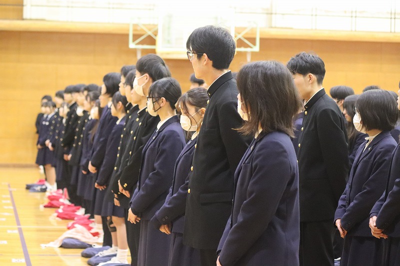 3月19日(木)、高校の3学期終業式、附属中の3学期修了式が行われました。校長先生からは、冬季ミラノ・コルティナオリンピックに出場した日本代表選手のお話をもとに、失敗を成長の糧と捉え、努力を続けることの大切さについてお話がありました。その後、今年度で福知山高校を離れるALTのアリエル先生から、お別れのメッセージがありました。続けて、今学期に作文コンクールや美術作品で入賞した生徒に対して伝達表彰が行われました。最後に、生徒指導部長から「SNSを利用したいじめに関する注意喚起」、「自転車の交通ルール」、「何事にも思いを持って取り組むことの大切さ」に関する講話がありました。