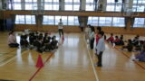 4年生は、1年生と2年生が2~3人のペアを作り、「ジャンケン列車」を行いました。「ジャンケン列車」は、それぞれの先頭同士がジャンケンをし、負けた列車が勝った列車の後ろにつながっていくゲームです。ジャンケンを繰り返すうちに、列車はどんどん長くなり、最後には全員がひとつにつながった、とてもなが~い列車ができあがりました。