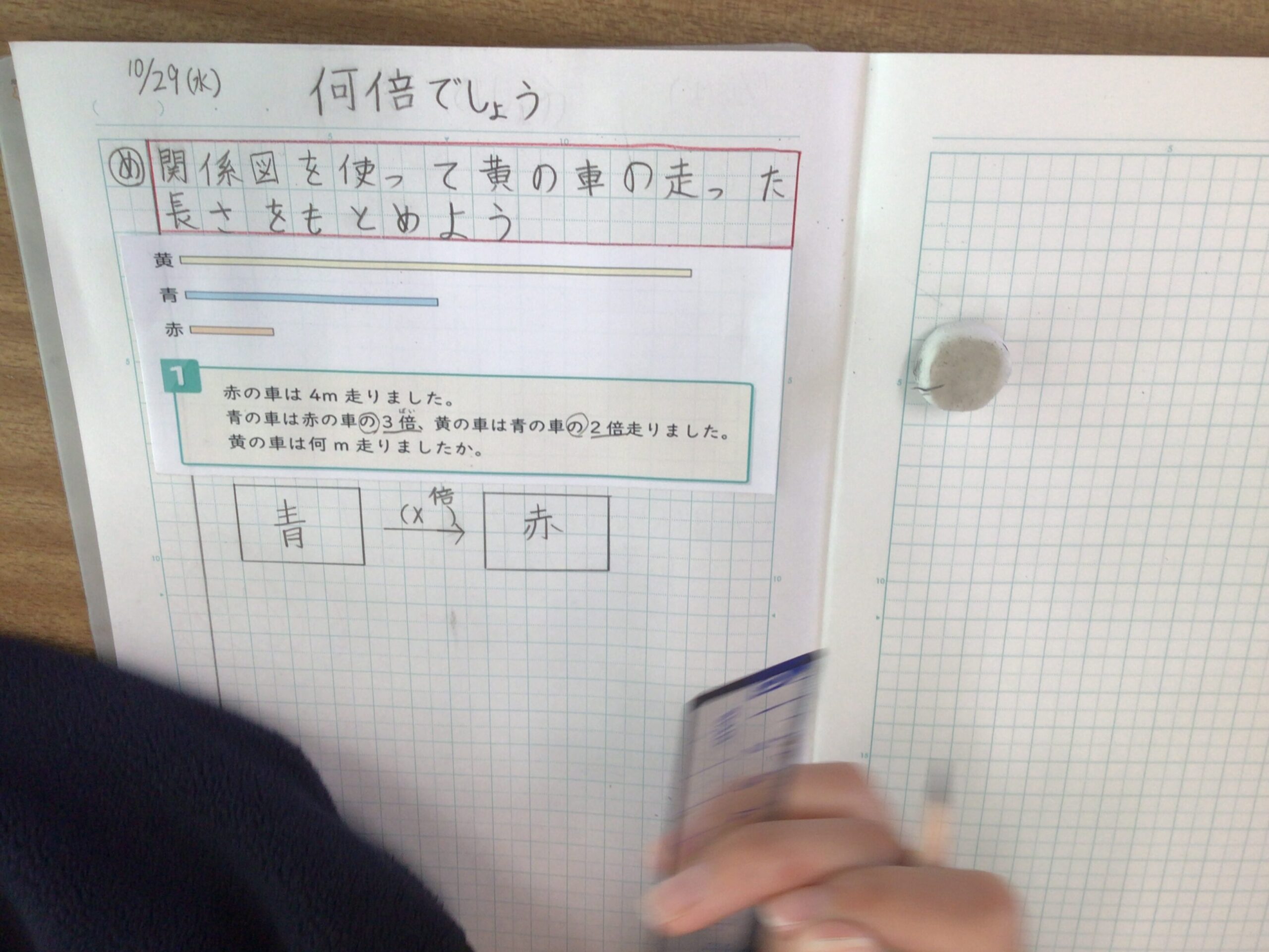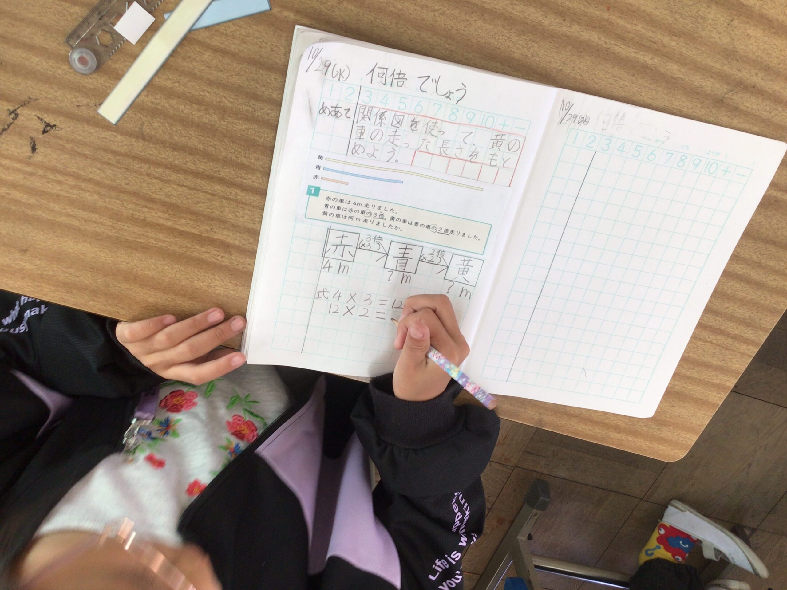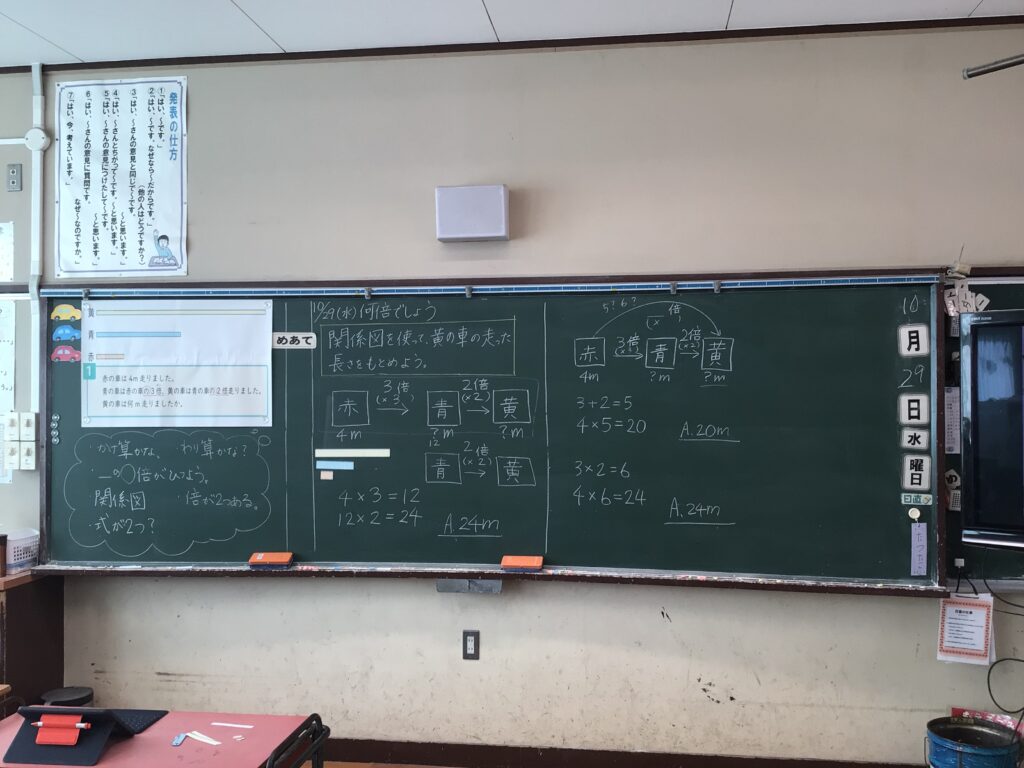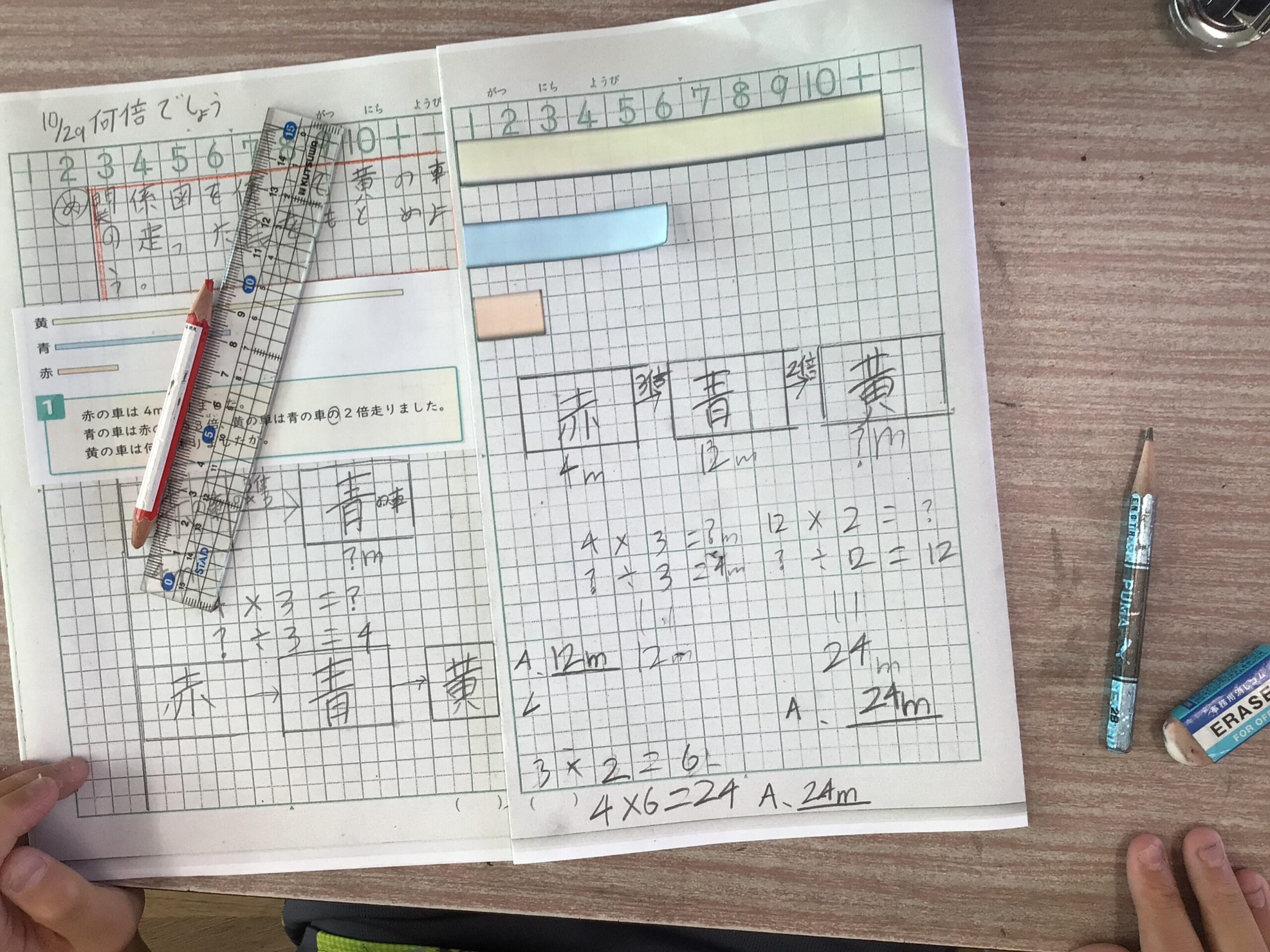 10月29日(水)に研究授業を3年生の算数の授業で行いました。授業では、「赤の車は4m走りました。青の車は赤の車の3倍、黄の車は青の車の2倍走りました。黄の車は何m走ったでしょう?」という問題に取り組みました。