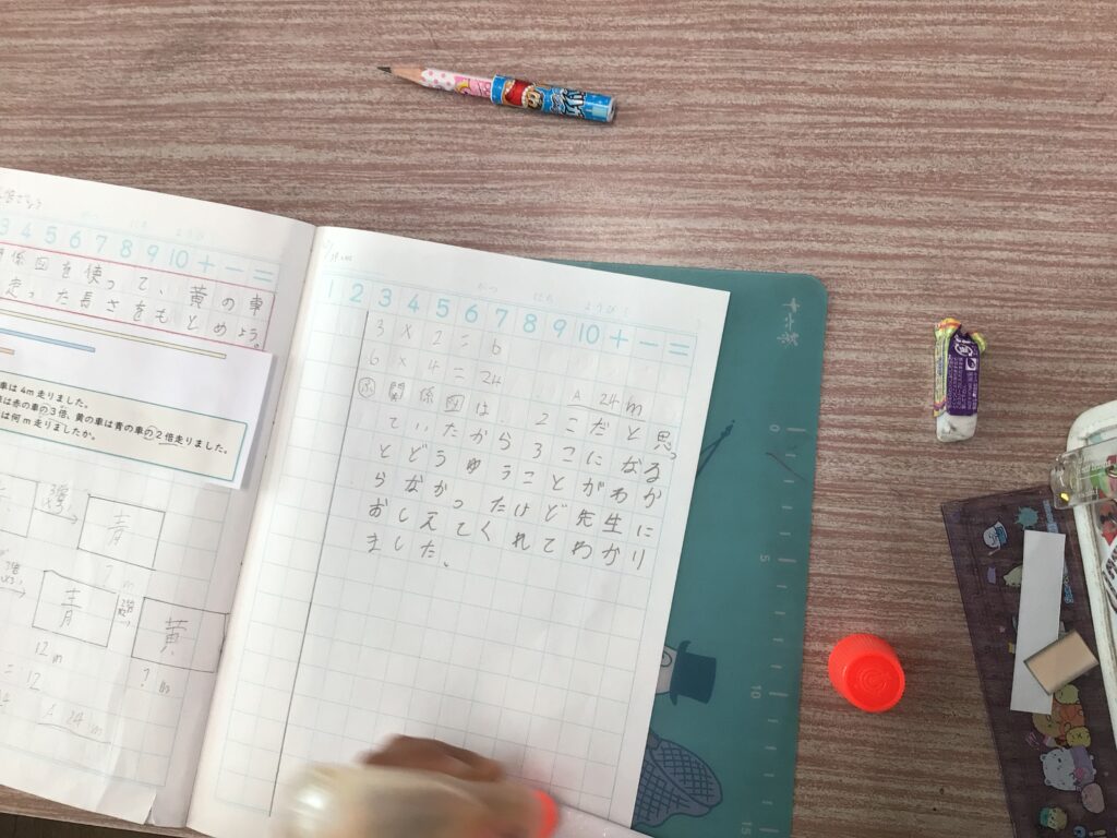 子どもたちはまず関係図を書き、赤・青・黄の車の走る距離の関係を整理しました。そのうえで、黄の車が赤の車の何倍走ったかを考え、「5倍? 6倍?」と悩みながらも、自分の考えを根拠をもって説明しようと頑張りました。