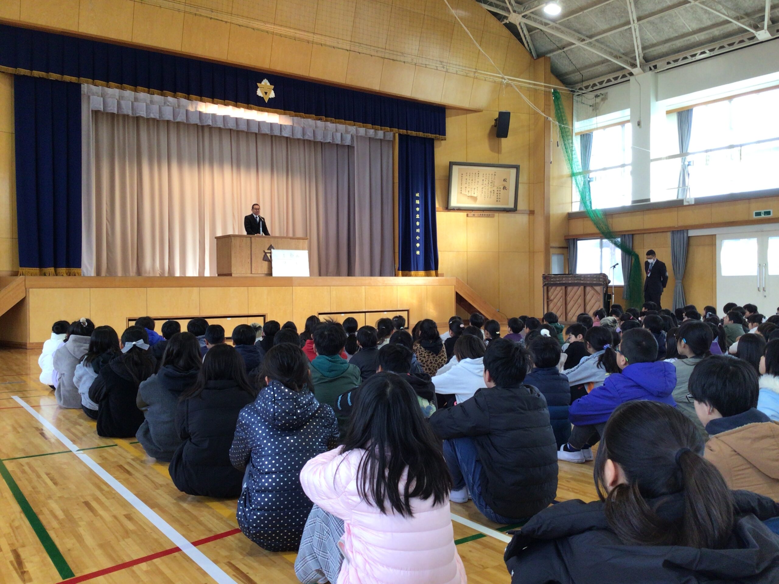さて、1月7日(水)より、いよいよ3学期がスタートしました。始業式は体育館で行われ、全校児童で校歌を歌い、校長先生のお話を聞きました。