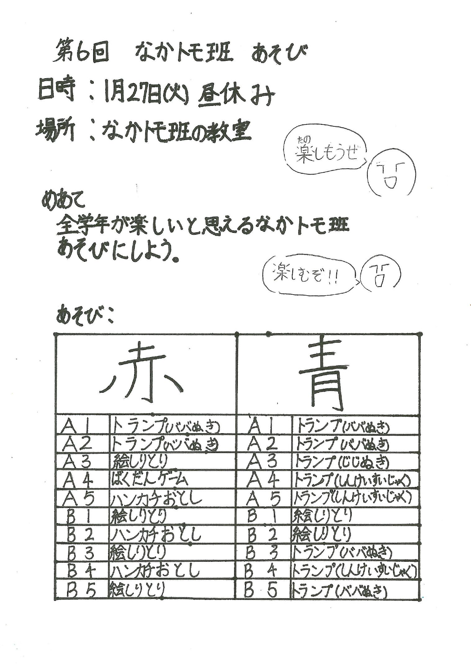 なかトモ班遊び(全学年) 全校 2026.01.27 1月27日(火)の昼休みに、なかトモ班遊びを行いました。本日のめあては、「全学年が楽しいと思えるなかトモ班遊びにしよう」です。 赤チーム・青チームそれぞれ20班に分かれ、教室ではトランプや絵しりとり、ハンカチ落としなどのゲームを楽しみながら交流しました。上級生が下級生に優しく声をかけたり、みんなでルールを工夫したりする姿が多く見られ、学年を超えた温かな関わりが広がりました。 外は寒い一日でしたが、古川小学校の校内には笑顔と笑い声があふれ、心温まるひとときとなりました。 Post Views: 3