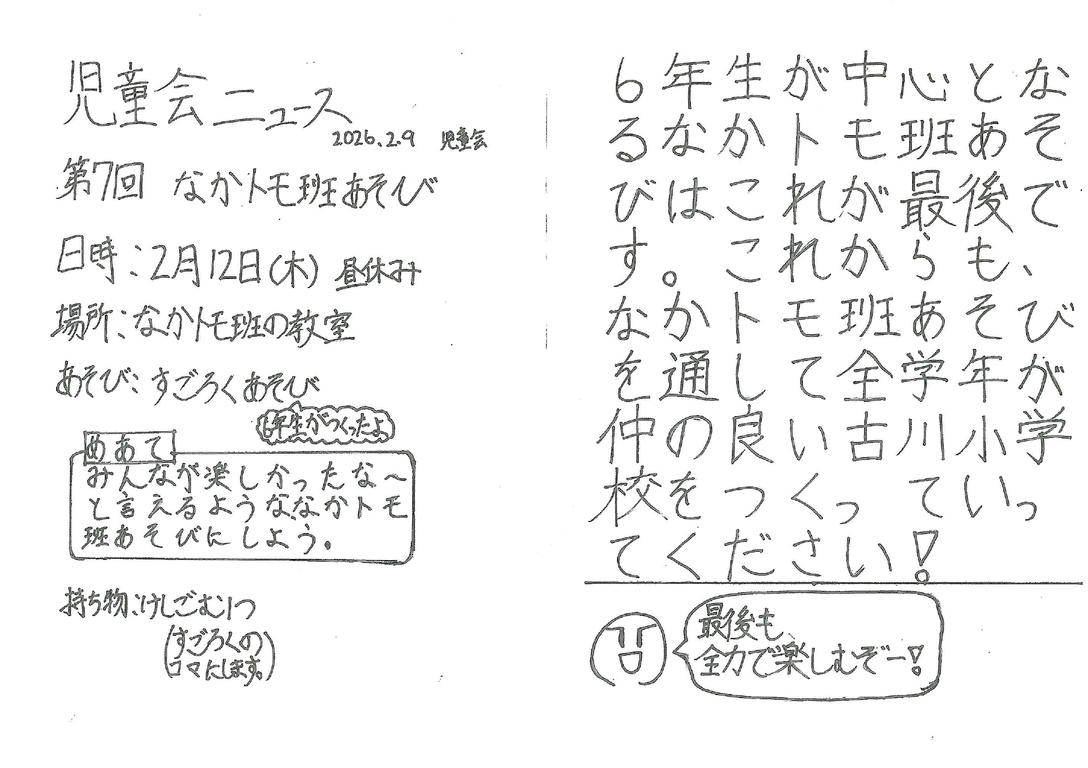 2月12日(木)に、なかトモ班遊びを行いました。6年生が中心となって活動してきたなかトモ班遊びは、本日が最終回となりました。