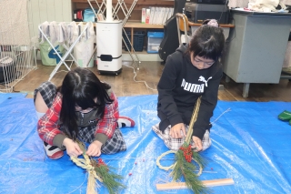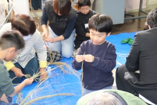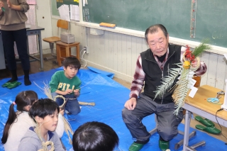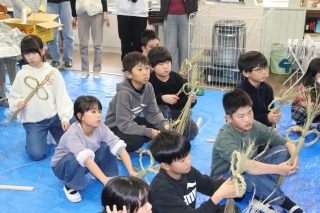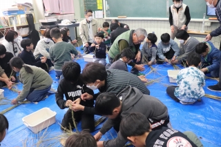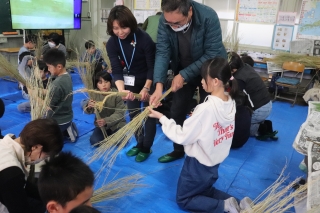 4年生は、総合の米作りの学習の一環でかがやき学級と一緒に地域の方にお世話になり、しめ縄づくり体験をしました。