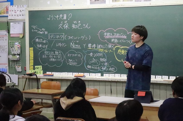 6年生は今日、胡麻郷小学校の卒業生で、外国で仕事をし、暮らしている先輩に来ていただき、外国での暮らしについてや、ご自身のこれまでの歩み、そして6年生へのメッセージをいただきました。