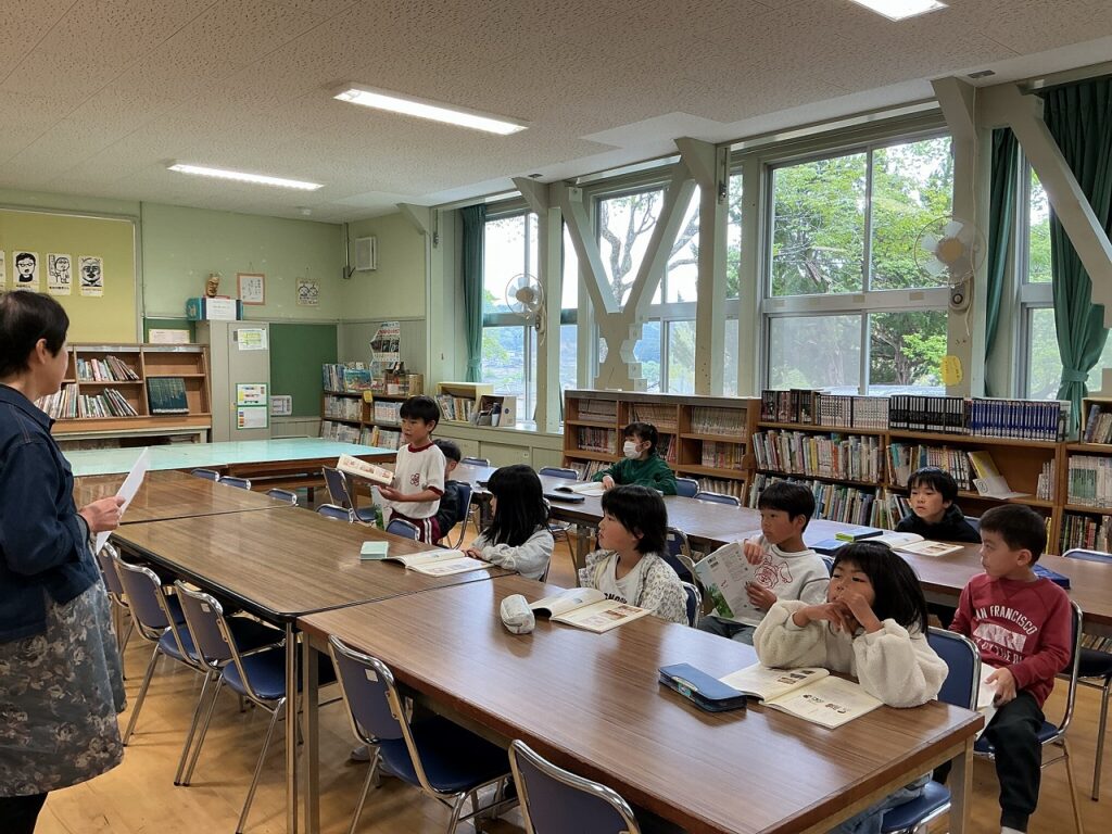 3年生の国語科「図書館たんていだん」は、図書館の仕組みや本の探し方を学ぶ学習です。今日は、「本は0から9までの数字で分類されていること」や、「本の背にあるラベルには、作者の名前の頭文字が書かれていること」を学びました。作者が外国人、例えば “エリック・カール” だと、”エ” ではなく “カ”と表記してあるところが、子どもたちには難しかったようです。
