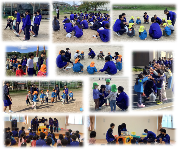 3年生の家庭科の授業で、幼児とのふれ合い体験を実施しました。かえでこども園を訪問し、おにごっこ、ドッチボール、じゃんけん列車など事前に遊ぼうと考えた遊びを班で交流しました。また、全体では絵本の読み聞かせを中学生が披露したり、いつも園児がしている体操を一緒に踊ったりしました。生徒の感想には「想像よりしっかりと話を聞いてくれたり、全力で楽しんでくれたりして嬉しかった。」、「自分たちでお互いに解決し合える姿をみて、感心した。」、「楽しむ中でもルールが大切だということを実感した。」などがありました。普段の学習では学べないことを体験的、実践的に学ぶことができました。体験を通して幼児との接し方を学んだり、新しい発見をしたり、多くのことを実感したりすることができました。これからの生活にこの経験を活かしていってほしいと思います。お世話になったかえでこども園の皆様、ありがとうございました。