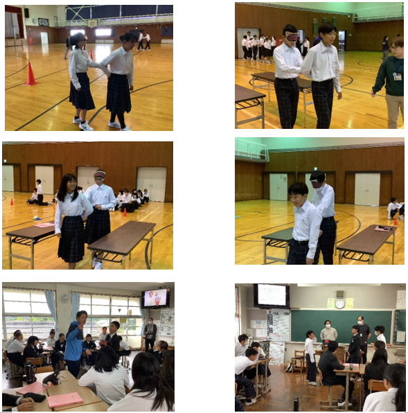 21日(火)には、講師として与謝野町社会福祉協議会から3名の方にお世話になり、「アイマスク・手引き体験」を行いました。生徒たちは、2人1組で「目の不自由な方」と「手引き者」それぞれの立場を体験し、視覚障がいがある方の気持ちや、適切な手引きの仕方を考えました。