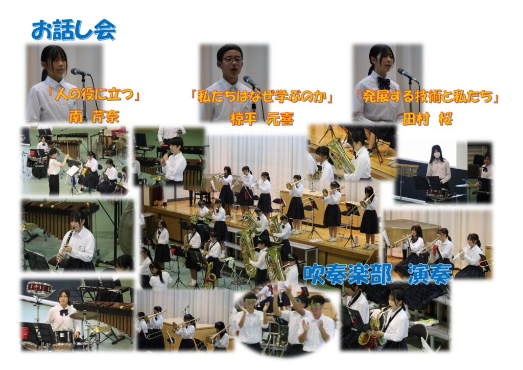 講話の最後には、「将来の地球環境を考える時、現代世代の私たちが気候変動にどう対処するかが非常に大切である。」といった言葉がありました。講話を聞いた生徒たちの感想には、「節電を意識したり、大人に向けて声を上げたりして、自分たちが住んでいるこの地球を守れるように頑張りたい。」「地球温暖化どころか、地球沸騰化とまで言われていることに驚いた。これからは、二酸化炭素を減らすことを他人ごとのように思わず、普段の行動を見直して、二酸化炭素を減らす努力をしたい。」など、今回の学びを今後の行動につなげていこうとする気持ちが表れていました。これから訪れる未来がどのような社会になってほしいのか、それを一人ひとりが考え、身近なところから行動を起こしていくことを期待しています。