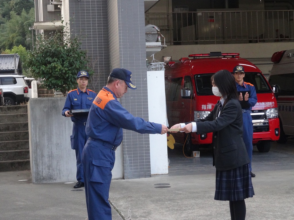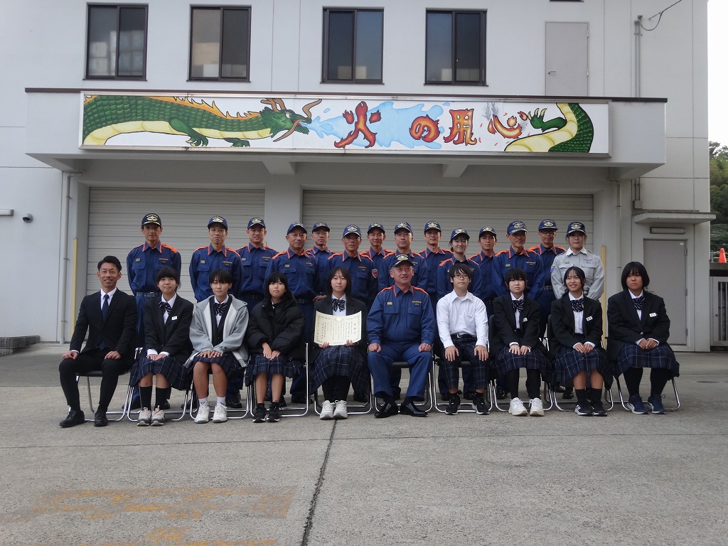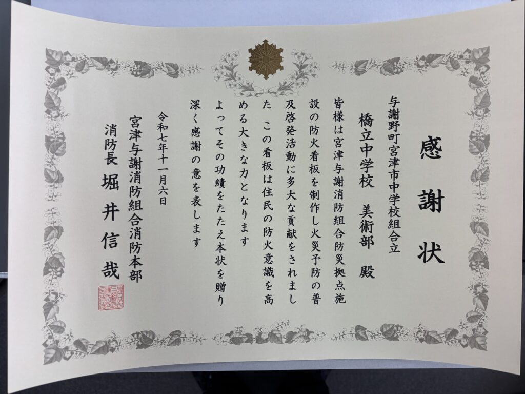 完成した看板は消防署の皆様からも「文字だけでなく絵があることで、明るく目を引く看板になった。」と好評をいただき、感謝状をいただきました。