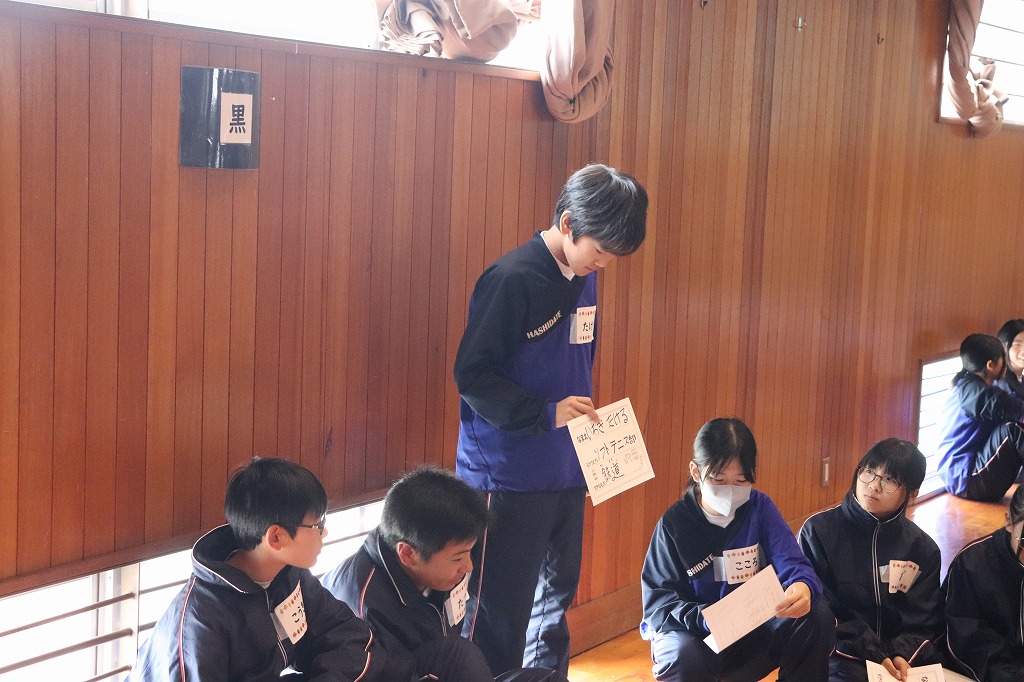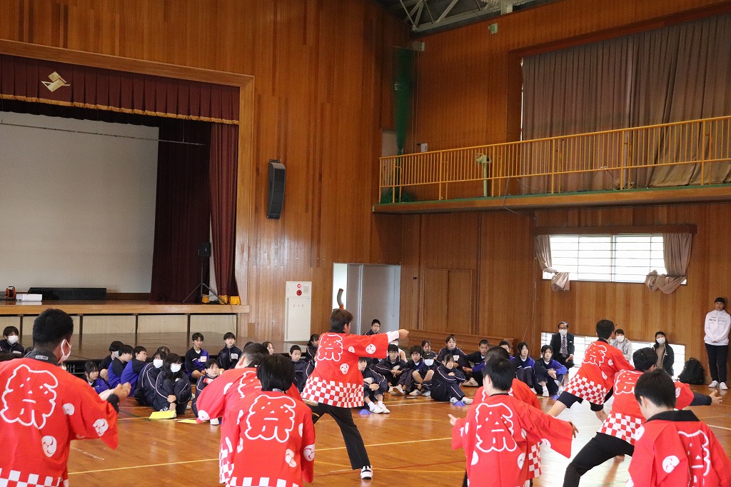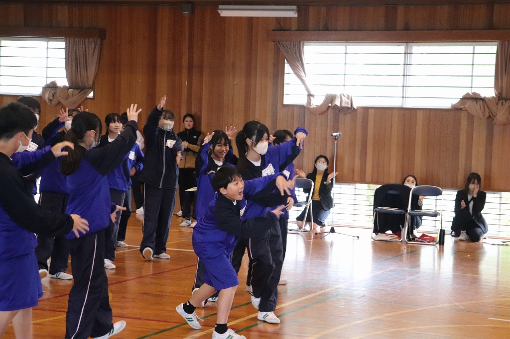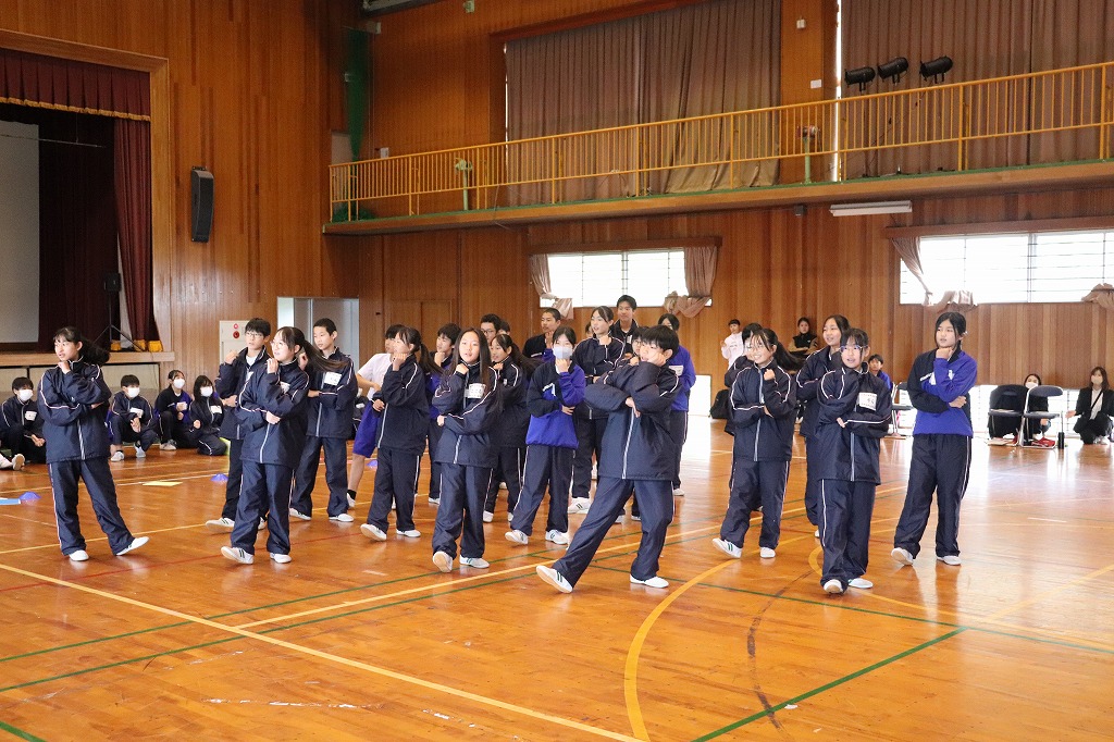 交流会では、体育祭で発表したブロックダンスを各学級が披露しました。手拍子をしたり、体が自然と動いたり、会場を盛り上げました。支援学校の皆さんには「よさのうみソーラン」を披露してもらいました。最後は定番の「じゃんけん列車」でさらに交流を深めました。また、施設見学や支援学校についての説明もしていただきました。