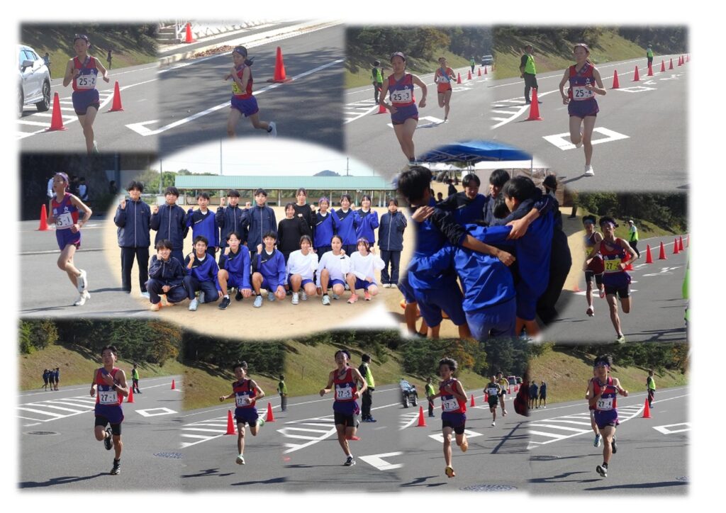 絶好の秋晴れのもと、京都府立丹波自然運動公園陸上競技場および周辺コースにて標記の大会が開催されました。ここ数年、男女とも出場を続けていますが、目標にしている近畿大会出場(5位入賞)はかなっていません。今年こそはと丹後ブロック予選が終わってからもメンバーを絞ってさらに練習に励んできました。女子1区はレベルの高い走力がそろった選手が多く、中盤順位でスタートし、2区以降は少しずつ順位を上げて最終13位でのゴールとなりました。男子は1区から5位でタスキをつなぎ、近畿出場ラインが見えていましたが、4~10位は混戦模様となり順位の入れ替わりも激しいレース展開でした。最後は一歩及ばず7位でゴールとなりました。