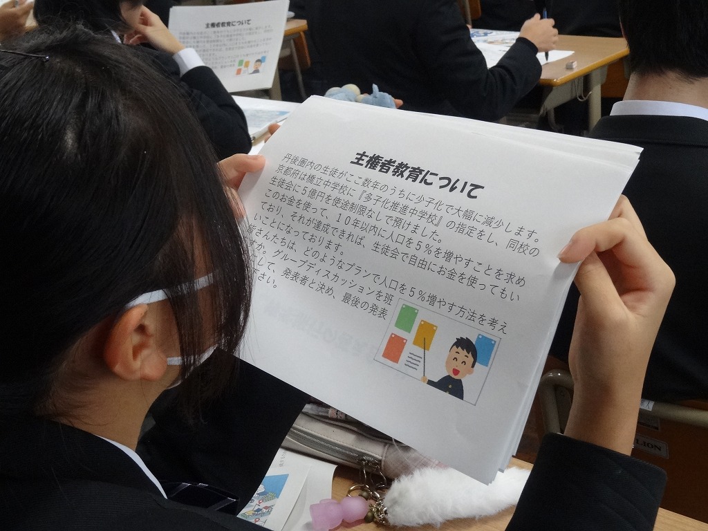 3年生は総合的な学習の時間に与謝野町観光協会より講師の方に来校いただき、「組紐ミサンガづくり」を行いました。この体験は、”ふるさと発信”の取組の一環で、修学旅行の班別自主研修において、現地でアンケート調査を実施し、答えていただいた方にお礼の品として進呈するためのものです。