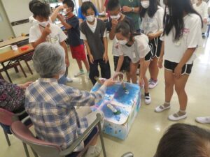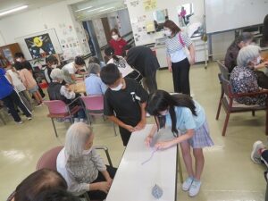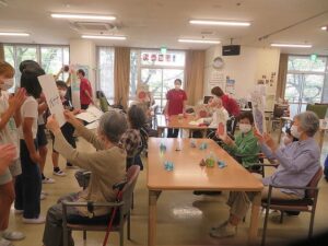 6年2組は、折り紙で作った紙風船を使ったお手玉遊びや、事前に作った紙飛行機を配って、「紙飛行機飛ばし大会」や輪投げを行いました。最も遠くまで飛ばした人には児童からのメダルのプレゼントがあり、大盛り上がりでした。歌は「ビリーブ」「翼をください」の2曲を披露し、身体を揺らしたり手拍子をしながら聴いてくださり、児童の高温の美しい声が響きました。
