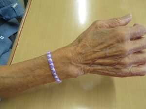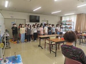 6年3組は、事前に途中まで作った毛糸のミサンガを最後一緒に仕上げ、出来上がったミサンガを一人ひとり手首に巻きプレゼントしました。ゲームでは、ペットボトルボーリングや机の上でできるペットボトル倒しを行い、ストライクが続出する度に大歓声が起こりました。歌は「しあわせなら手をたたこう」を披露し、手や足を歌に合わせてリズムよくたたく場面もありました。最後には、児童が施設の方にインタビューを行い、「みんな歌が上手でした。」「みなさんが本当にかわいくて、一緒に交流できて楽しかったです。」など、嬉しい感想をいただきました。