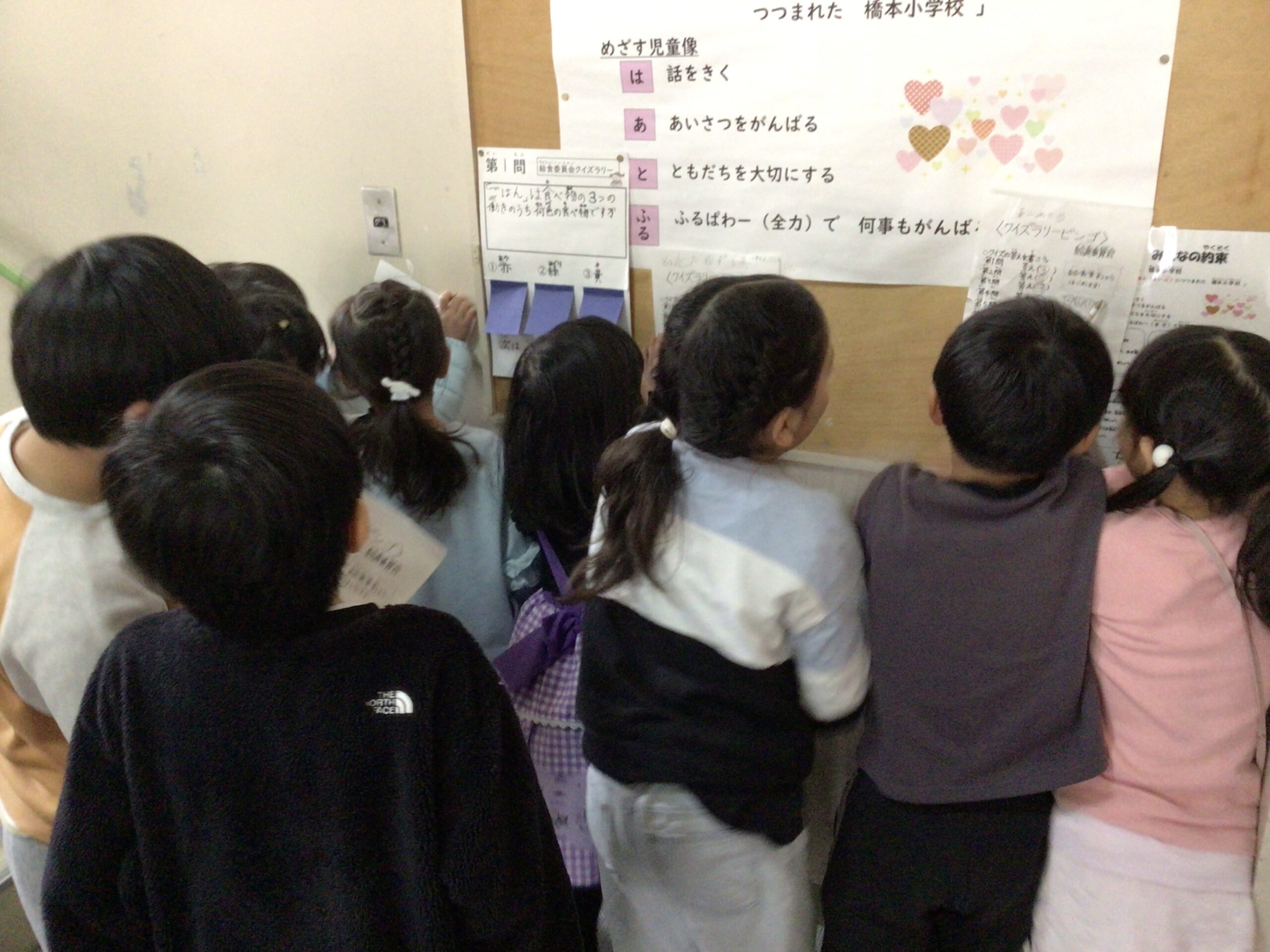 給食週間中は、給食委員会企画の「クイズラリービンゴ」が開催されています。楽しみながら友達といっしょに解いている姿がたくさん見られます。思っていた答えと違うものもあったようで、楽しみながら食べ物に詳しくなれるクイズになっているようです。