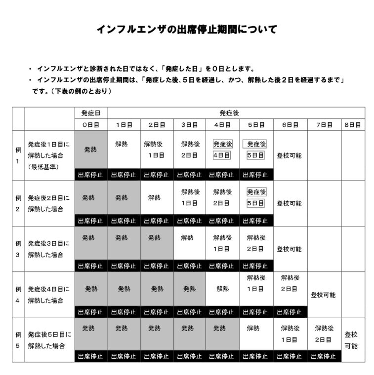 校内での感染拡大を防ぐため、この基準をもとに、学校が出席停止を決めるものです。(出席停止の期間は欠席になりません)