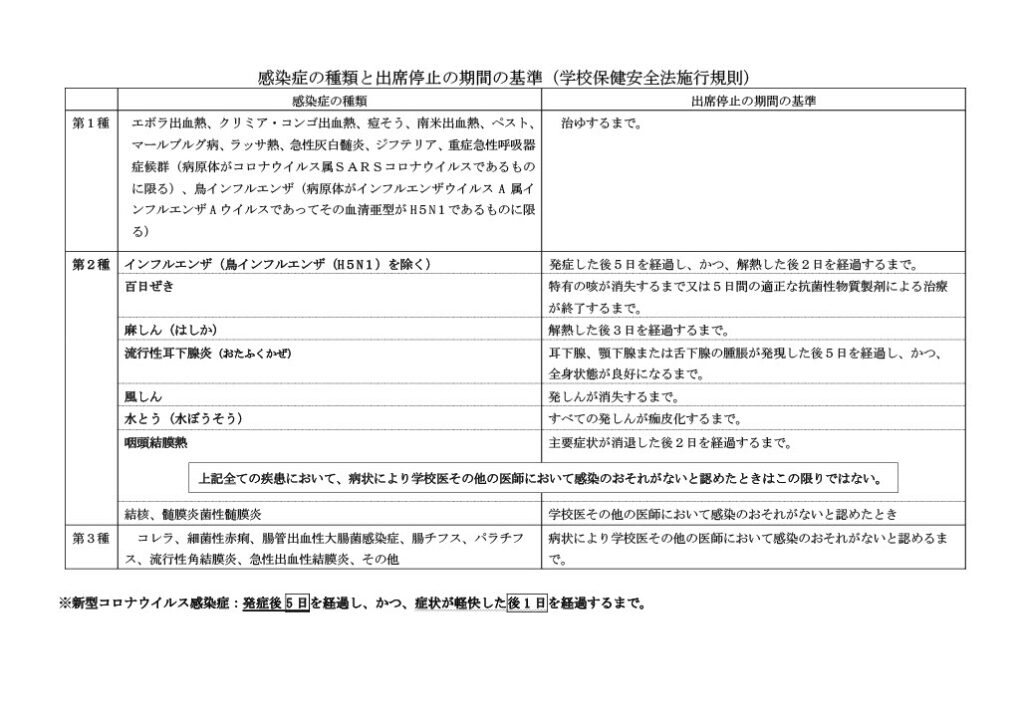 学校保健安全法施行規則により、「学校において予防すべき感染症」の種類と出席停止の期間の基準が定められています。