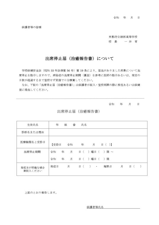感染症(疑いも含む)又は下記の症状があり、自宅療養した場合、保護者が「学校感染症欠席届」に記入してください。ダウンロードができない場合、登校可能となりましたら、保健室に用紙を取りに来てください。生徒は「学校感染症欠席届」を提出してください。(提出先:担任又は保健室)