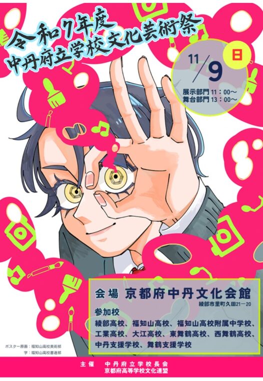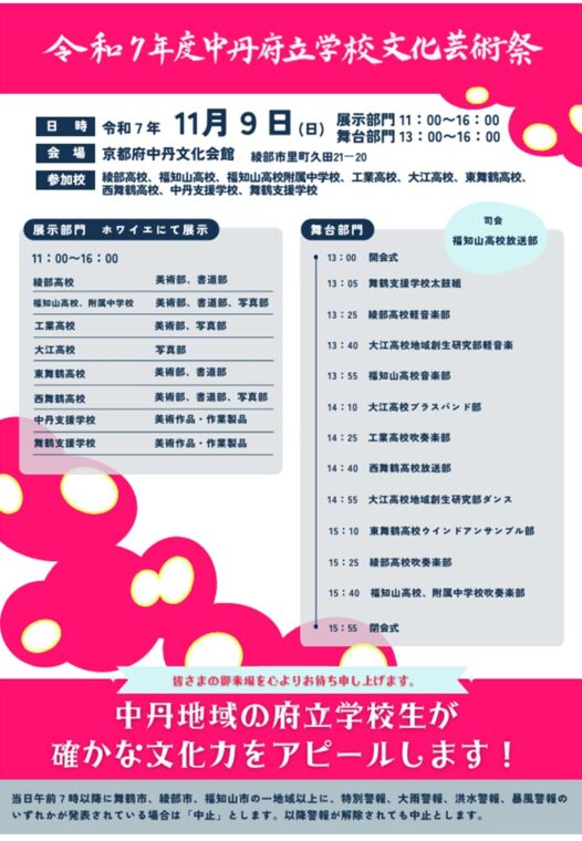 中丹府立学校文化芸術祭が開催されます! のうえんか Twitter Facebook はてブ Pocket LINE コピー 2025.11.07 11月9日(日)に中丹府立学校文化芸術祭が京都府中丹文化会館で開催されます。綾部高校からは、美術部・書道部が展示部門に、軽音楽部・吹奏楽部が舞台部門に参加します。多数のご来場をお待ちしています! Post Views: 34