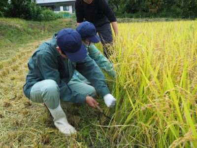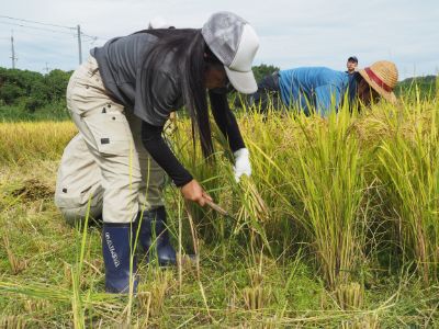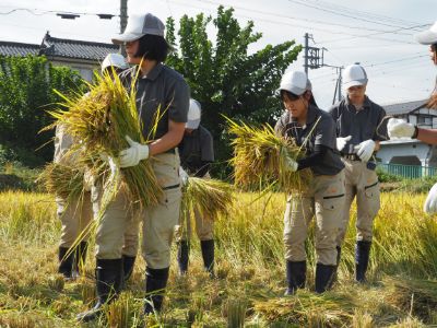 由良川キャンパス1年生は、農業科だけでなく、園芸科と農芸化学科でも稲作を体験します。それぞれの学科で手刈りによる稲刈りを行いました。