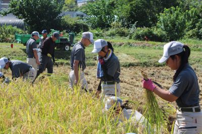 のうえんか 由良川キャンパス1年生は、農業科だけでなく、園芸科と農芸化学科でも稲作を体験します。それぞれの学科で手刈りによる稲刈りを行いました。