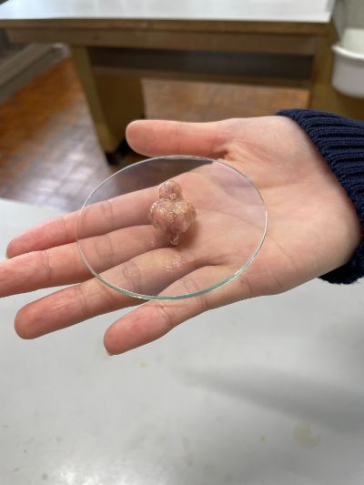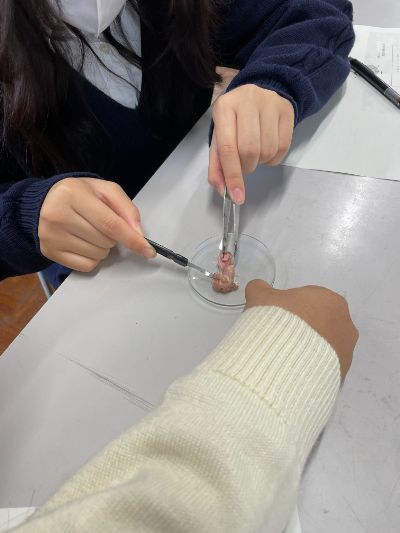生物基礎は、鶏頭を用いた脳の観察実験で、鶏頭から脳を取り出し、スケッチを行っていました。さらに、脳の重さを測り、体重に対する脳の割合をヒトとニワトリで比較し、考察を行いました。
