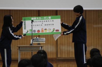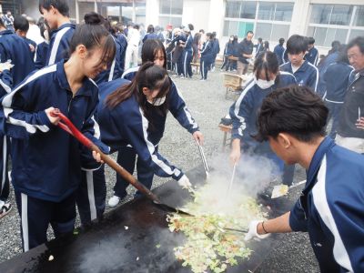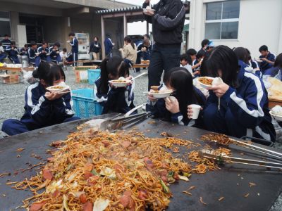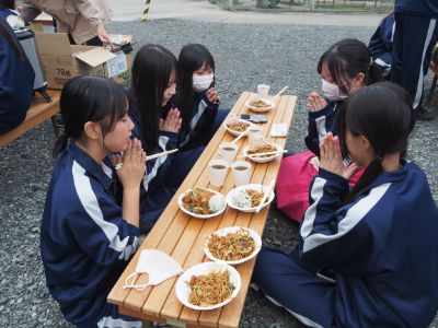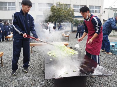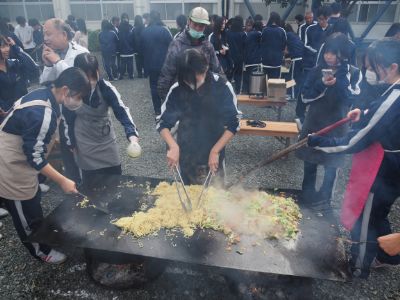 生徒会イベント後には、中庭でクラスごとに焼きそばを調理し、日頃の実験・実習の成果を全校生徒で味わいました。今年のメニューは、綾部高校産の野菜をふんだんに使った焼きそば、農業科生産「にじのきらめき」のおにぎり、デザートのたい焼きでした。