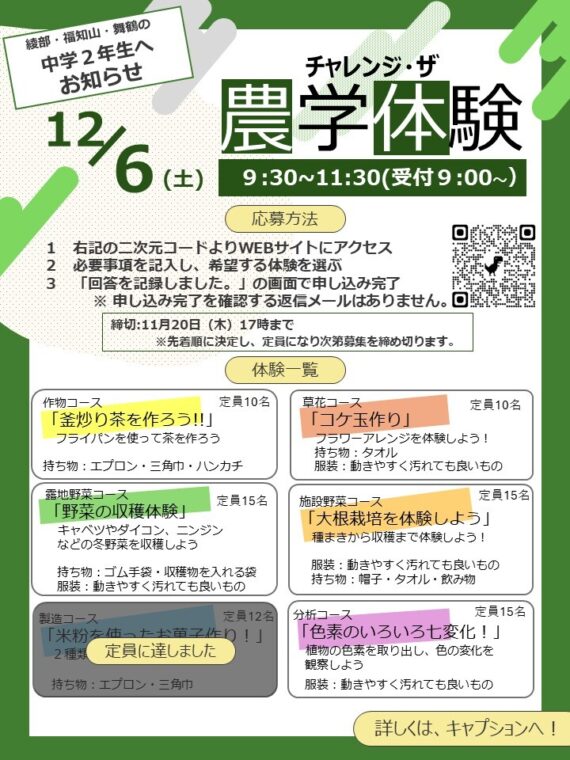 12月6日(土)に行う中学2年生向け体験講座「チャレンジ・ザ・農学体験」の参加者を募集しています。多くの申し込みをお待ちしています!