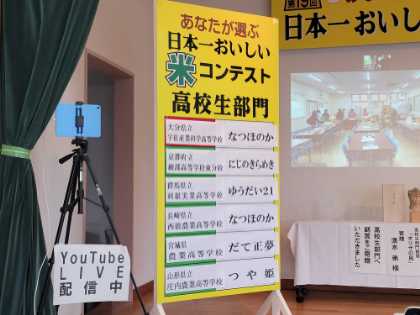 このコンテストは、審査員が実際にお米を食べておいしさを競うコンテストで、高校生部門には全国の農業系の高校から38校60点がエントリーし、予選審査の結果、上位6点が決勝大会に進出しました。綾部高校は初出品で初の決勝大会進出となりました。