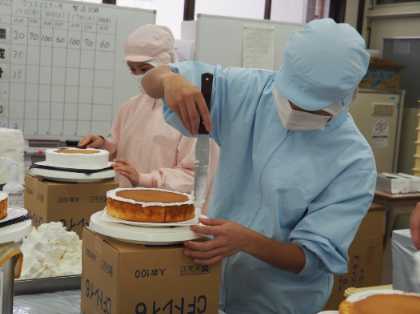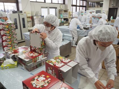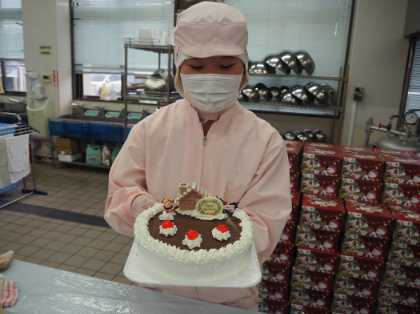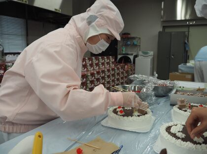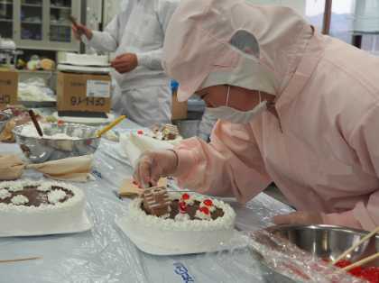 スポンジ台を焼き上げ、クリームとチョコレートでコーティングし、サンタやチェリーを飾り付け、箱に詰めて完成です。クリームの絞り出しなど、技術が必要な工程が多く、1つ1つ丁寧に仕上げていました。