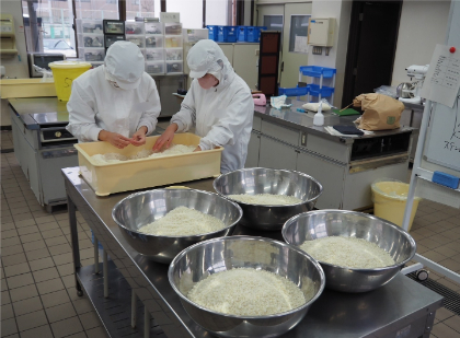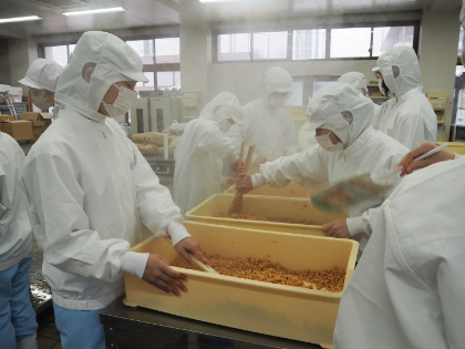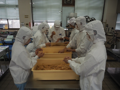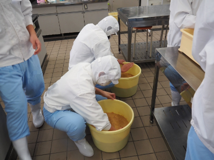 2年生農芸化学科では、1月から3月にかけて、みその製造方法を学習します。みそは発酵食品で、米麹の製造では麹菌の働きについて学び、発酵の仕組みを学習できる伝統食品になります。