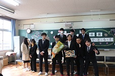 式典の終了後、控室でホームルームを行いました。副校長から卒業証書が手渡された後、卒業生から担任の先生へのサプライズプレゼントもあり、なごやかで心温まる時間を過ごすことができました。