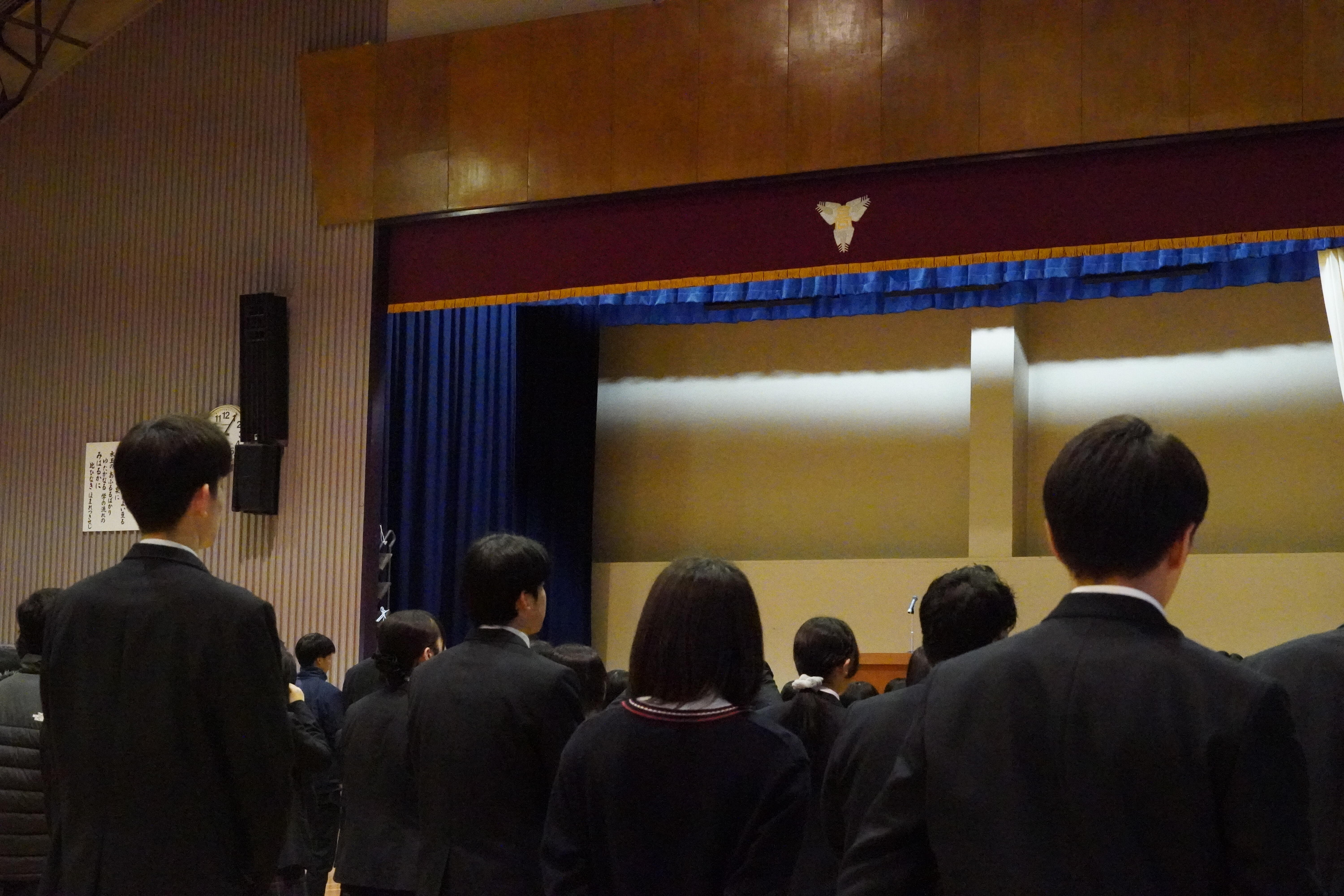 朝から雨が降り、一段と冷え込む始まりとなりましたが、3年生は卒業、1・2年生は進級が目前となる3学期ということもあり、生徒たちはとても落ち着いた様子で話を聞いていました。