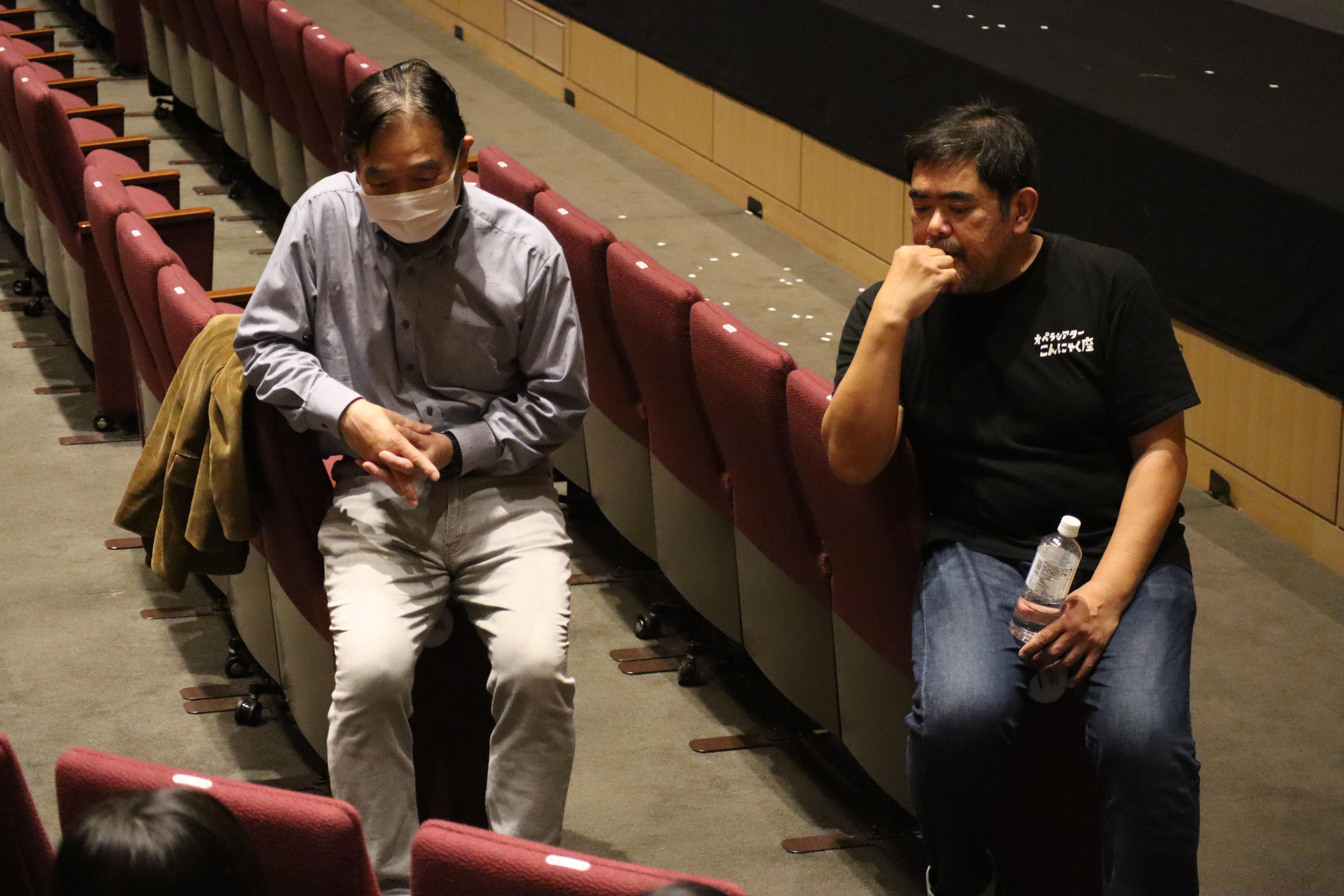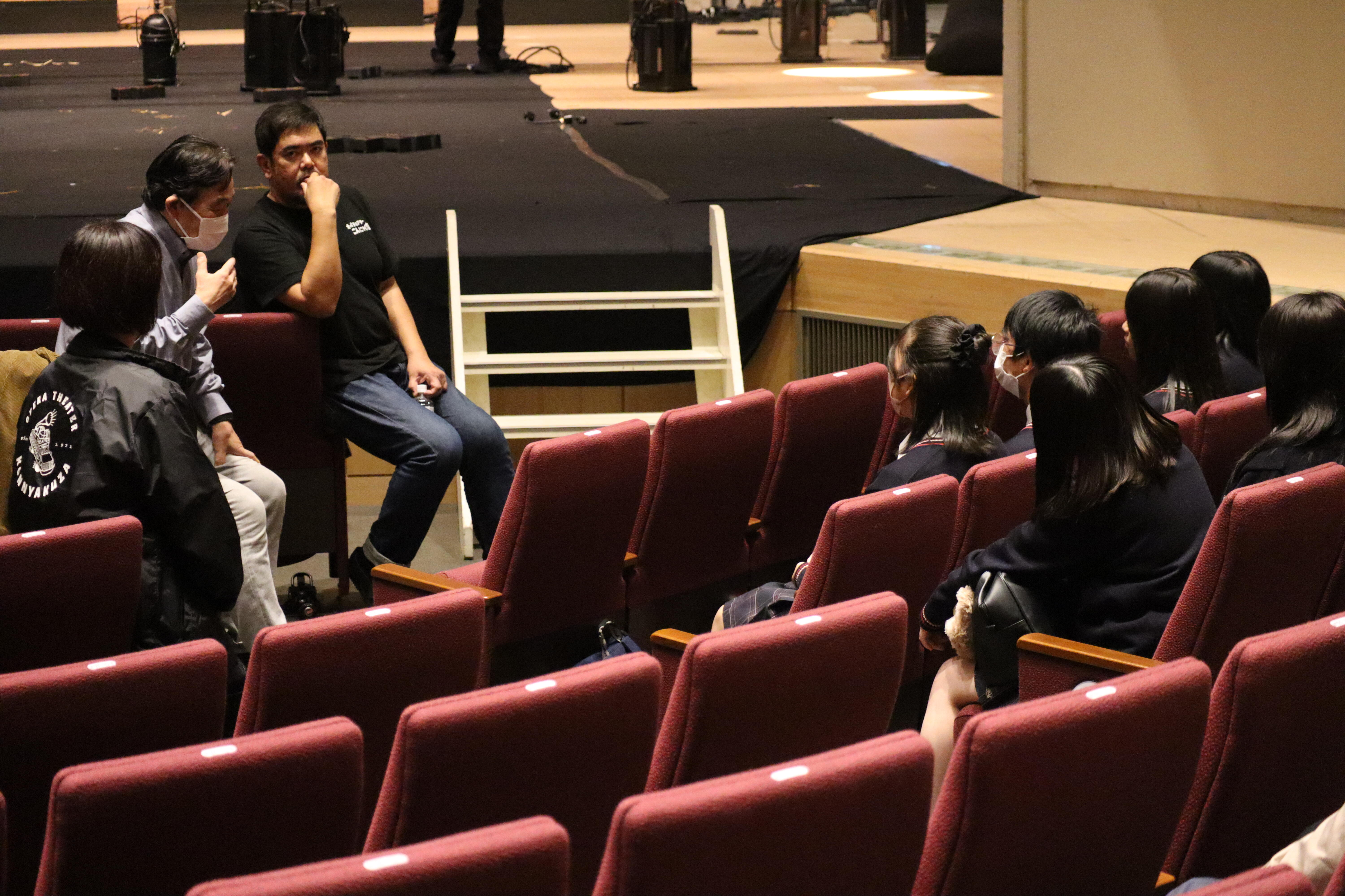 閉幕後は交流会も設けていただきました。さっきまで舞台上で見ていた役者さんたちとの交流に参加した生徒たちは、演劇について質問をしたり、観劇した感想を伝えたりなど真剣に取り組んでいました。劇団の方も生徒の質問に真摯に向き合い、舞台や演技について、実演しながらお話していただき、ときには冗談も交える場面もあり、始まりから終わりまでとても楽しい時間を過ごさせていただきました。