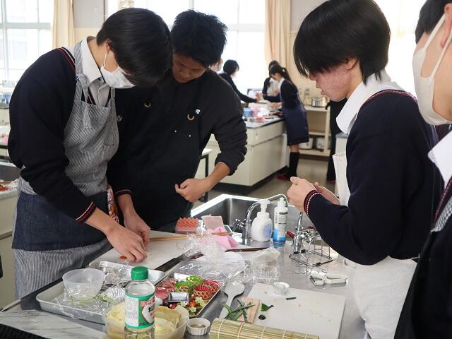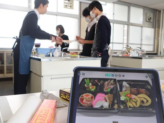 3年フードデザイン 今年も残りわずか。今学期最後の授業で、おせち料理をつくりました。おせち料理は、一年の幸せを願って食べられる、古くからの縁起物として伝えられてきました。本実習に先立ち、お重に詰められた品物一つひとつの由来や意味を調べレポートにまとめました。 実習では、細かい作業に苦戦していましたが、飾り切りは、やってみると意外に上手に切ることができて、自分の出来映えに満足していました。 «前の記事 次の記事»