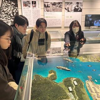 2月14日(土)、例年地歴・公民科の授業でお世話になっている京都府立大学歴史学科の東昇教授と文化情報学ゼミの学生のみなさんに向けて舞鶴引揚記念館で学生語り部として活動している本校生徒(2年生1名、3年生1名)が館内案内を行いました。