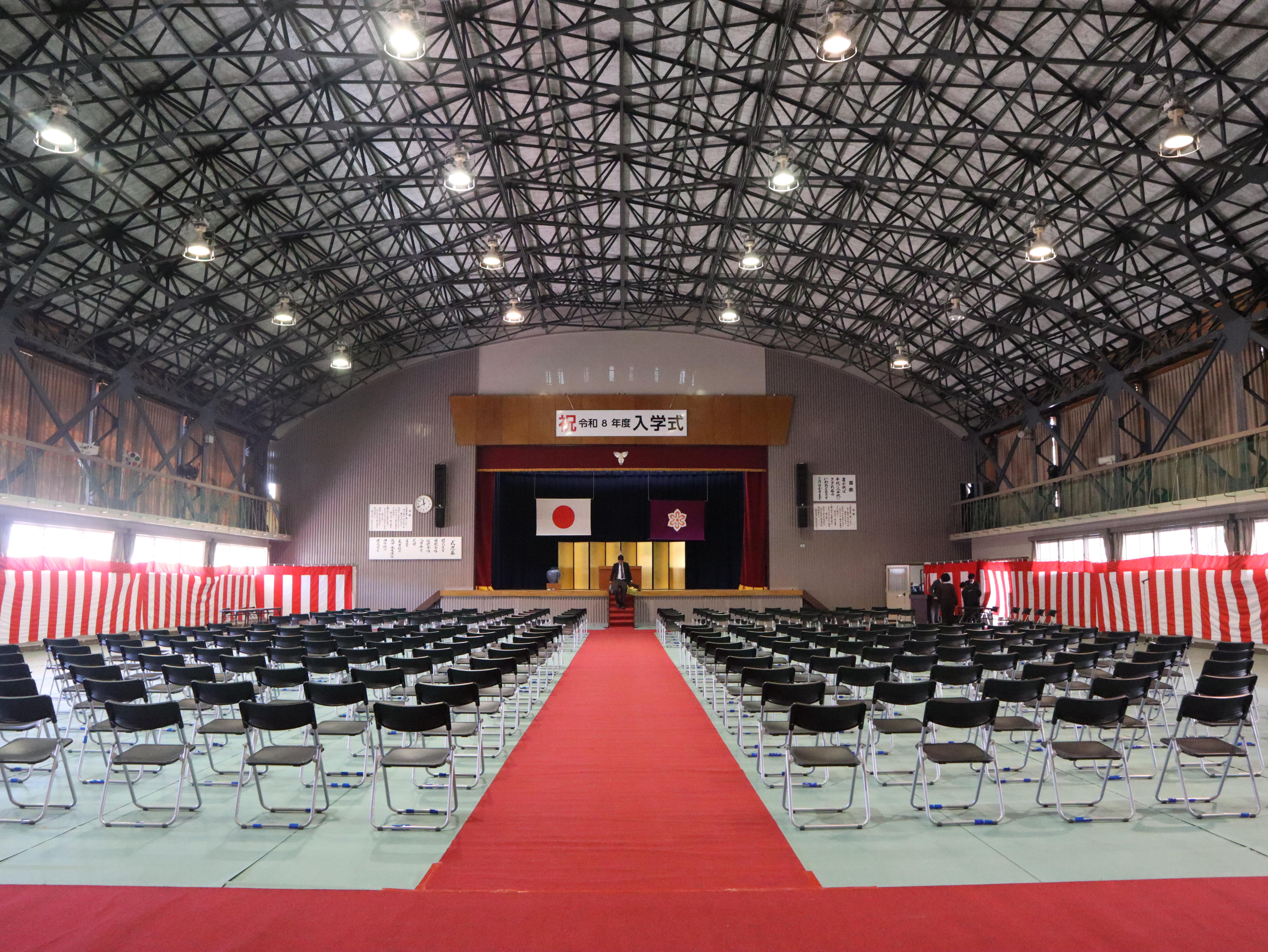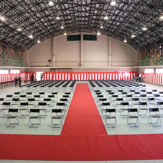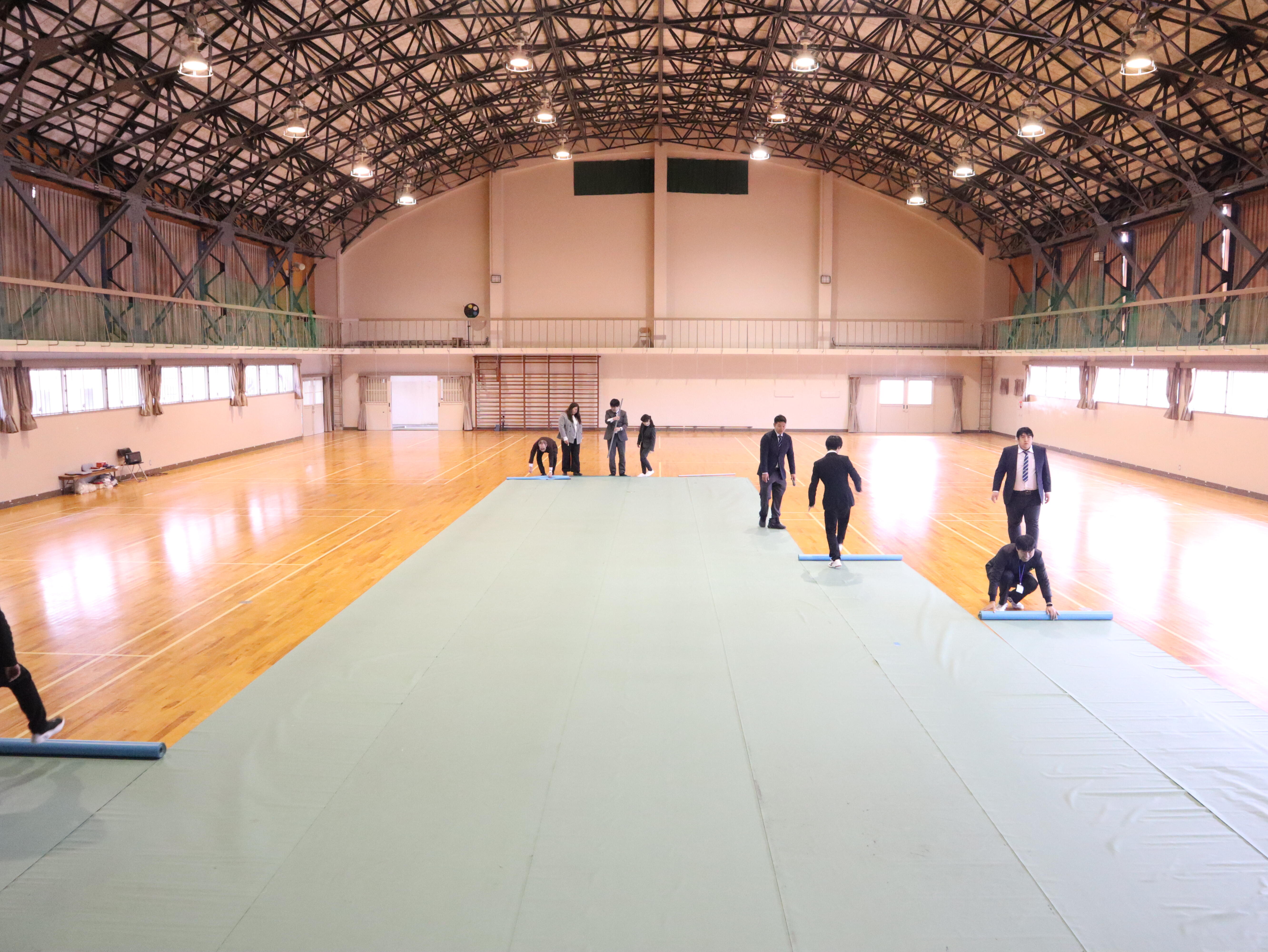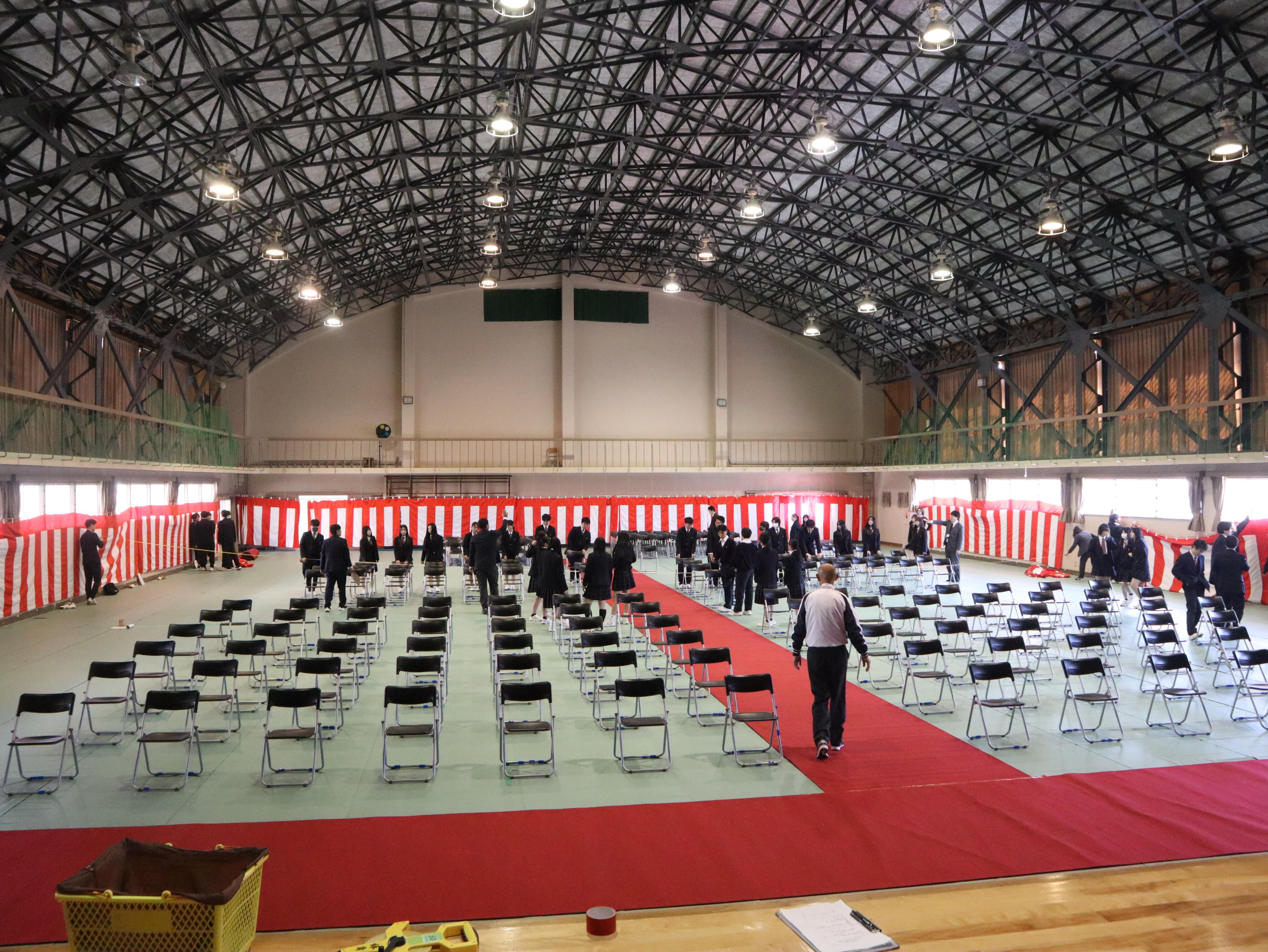 式典後、生徒と教職員が一丸となって入学式の会場設営を行いました