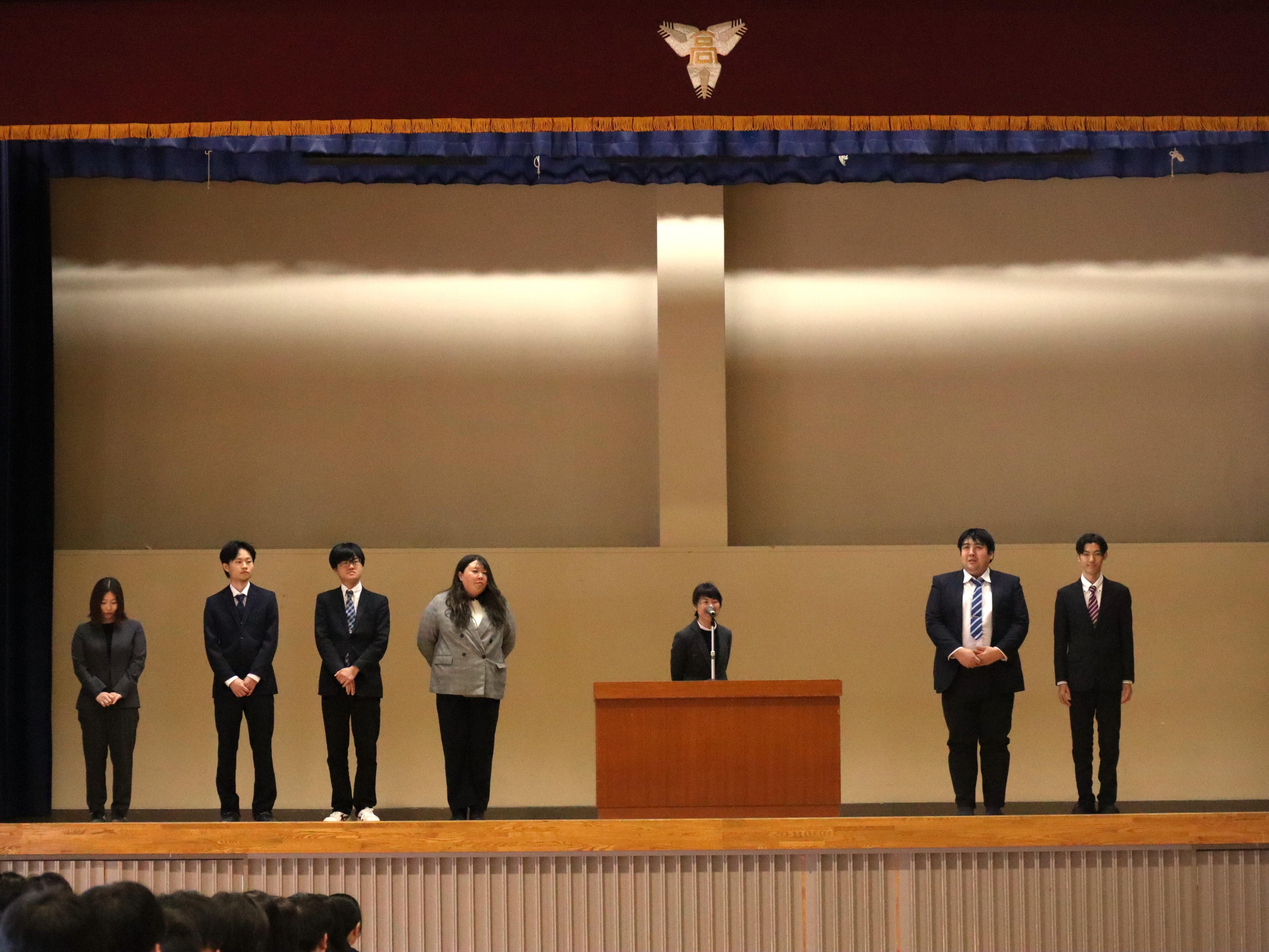 離任式と着任式では、離任・着任された先生方の紹介が行われ、着任代表の先生から「皆さんとの学校生活を楽しみにしています。一緒に頑張りましょう!」と力強い挨拶がありました。