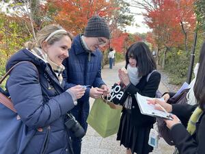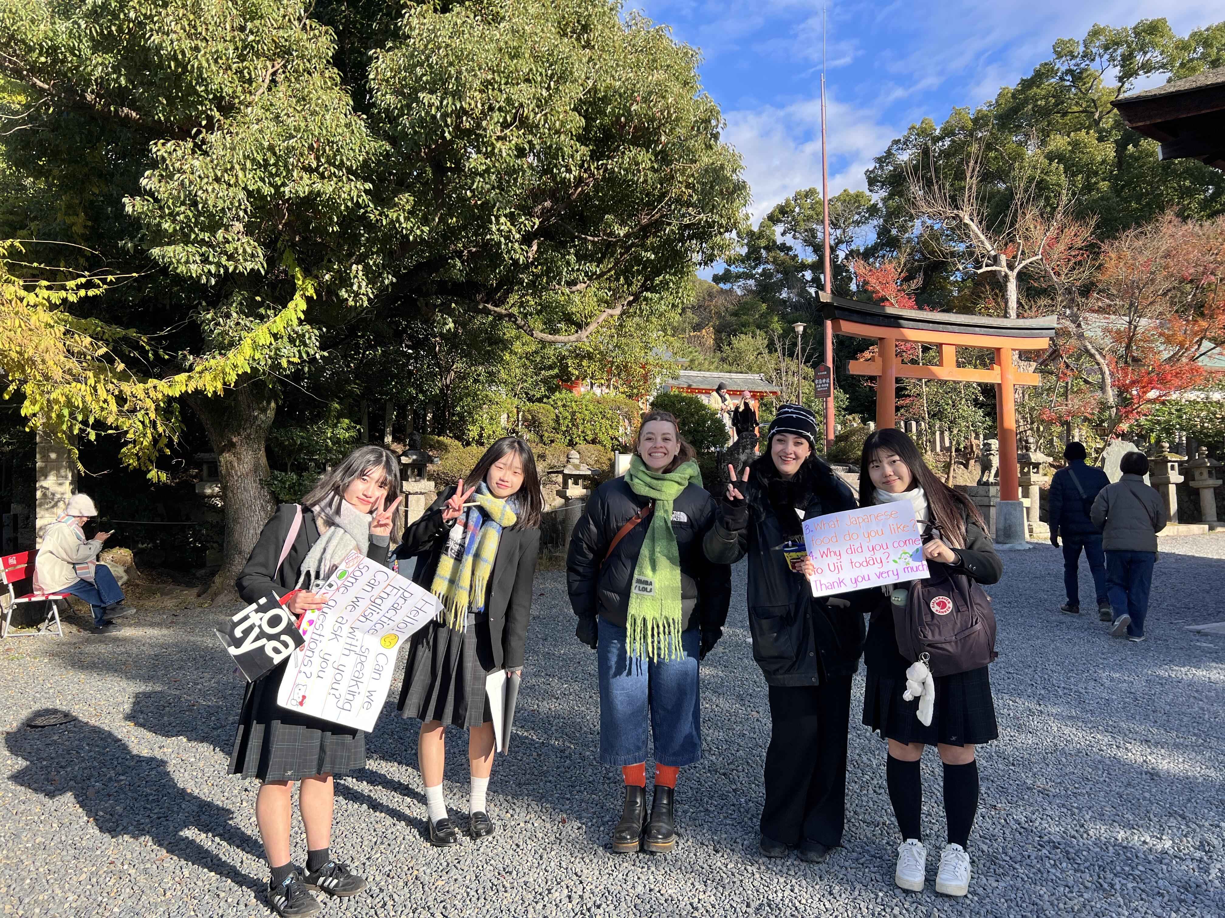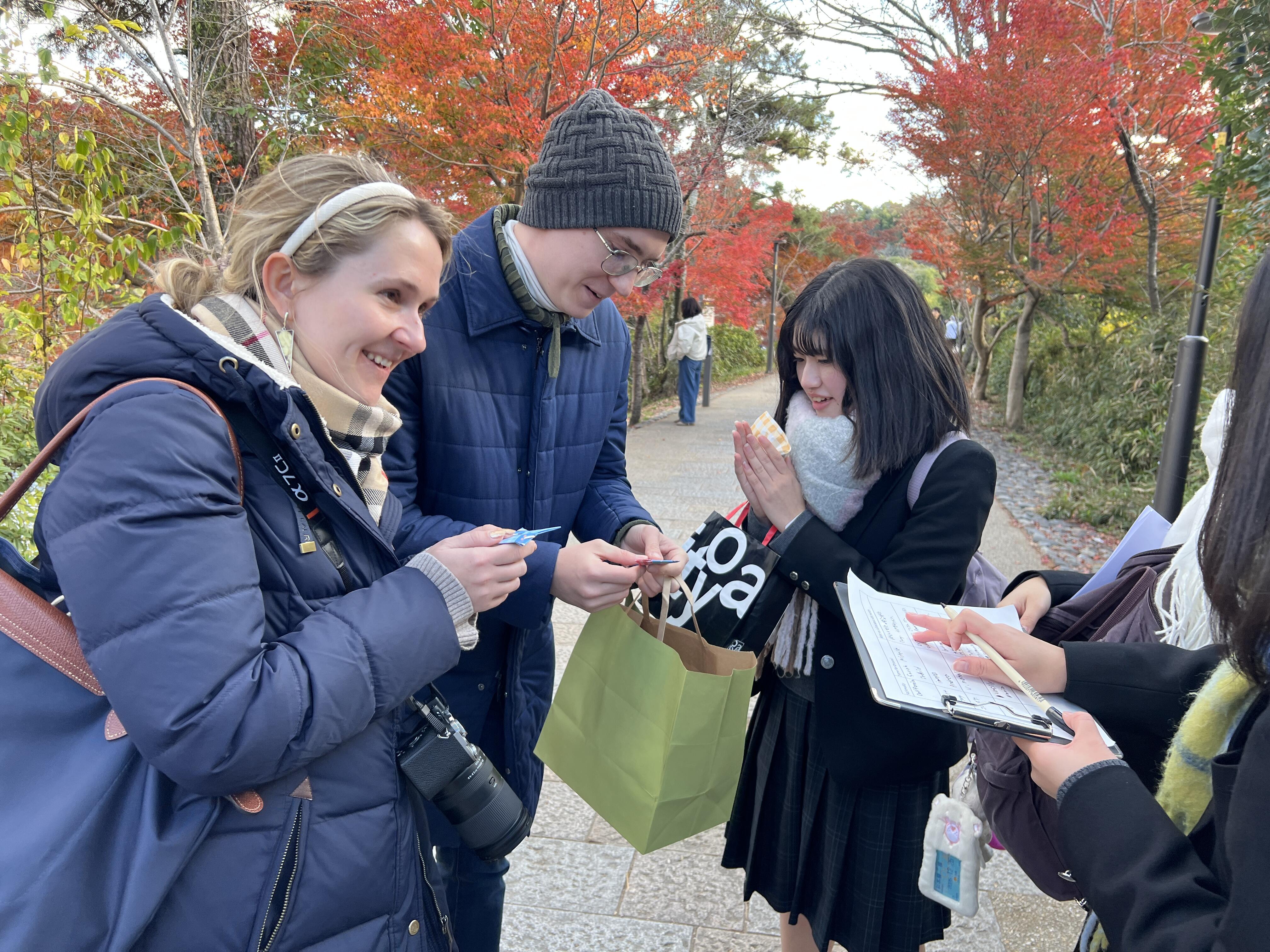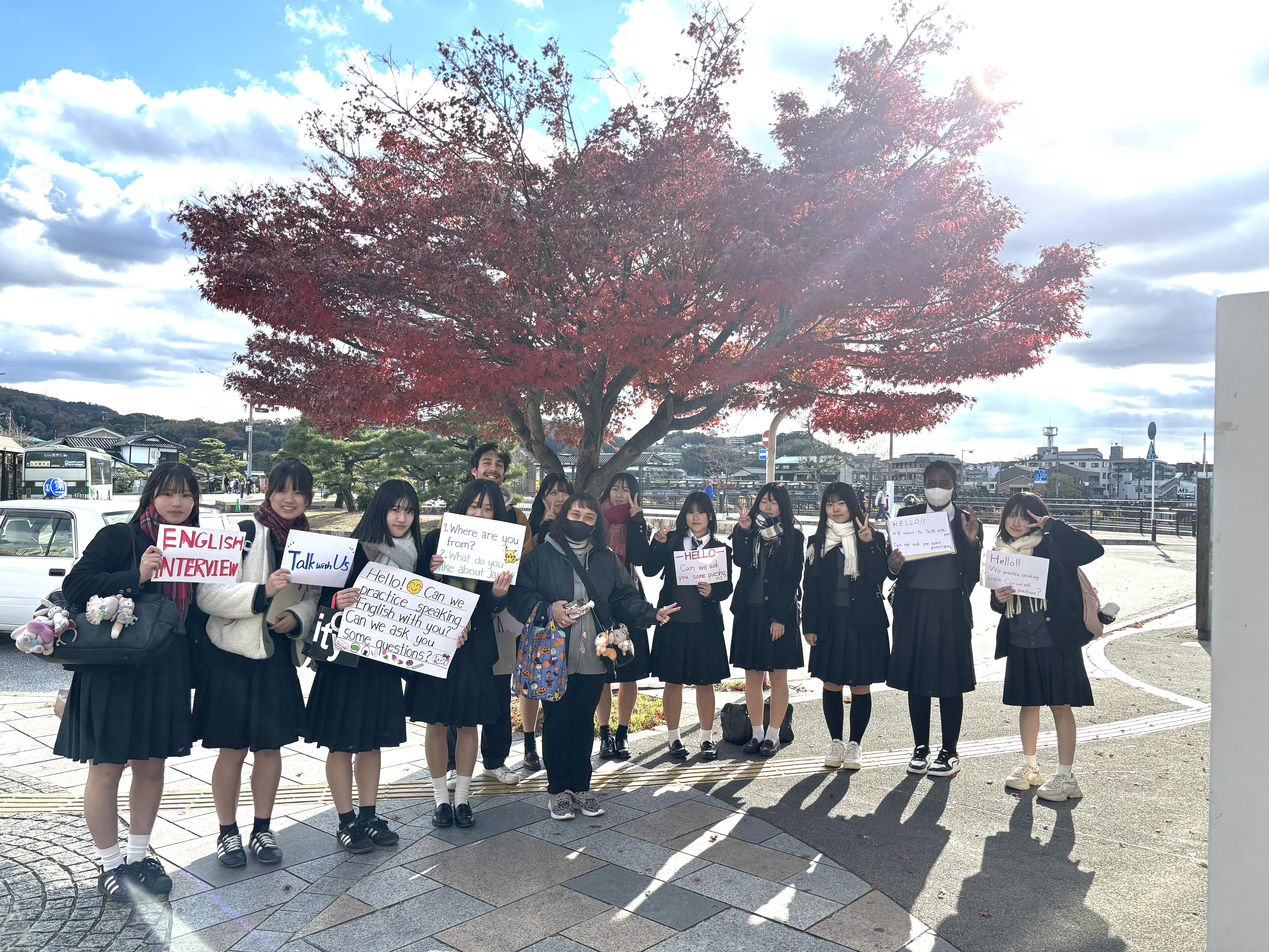 12月5日(金)に宇治橋周辺で外国人観光客に英語でインタビューする活動を行いました。生徒は3グループに分かれ、合計15か国、40名を超える方に日本に来た理由や好きな和食等について話を聞くことができました。