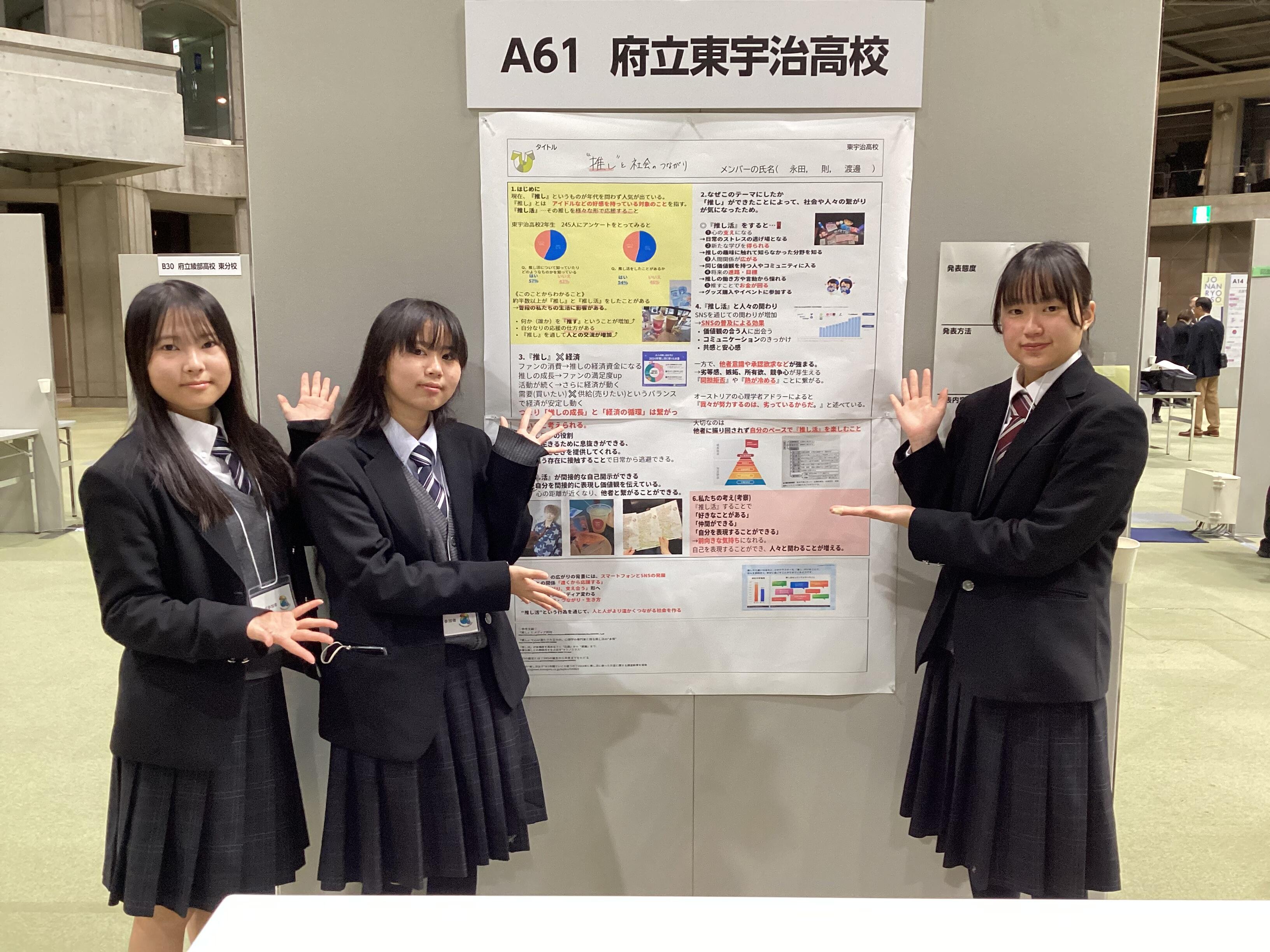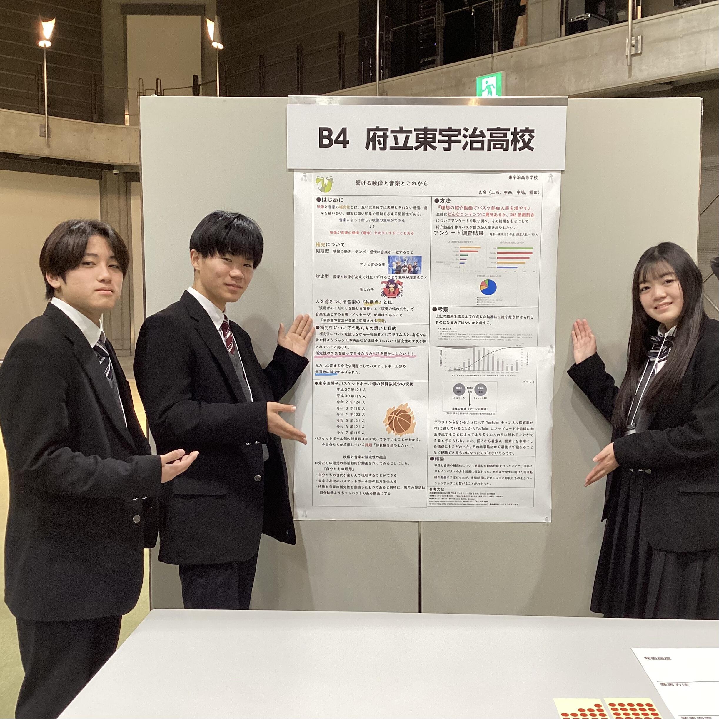 本校からは「"推し"と社会とのつながり」と「繋げる映像と音楽のこれから」の2グループが参加しました。日頃の探究学習のまとめを発表しただけでなく、来場者に付箋でコメントを書いていただいたり、自分たちが作成した動画を見てもらい感想を直接うかがうなど、「対話」を重視したポスターセッションを行うことができました。