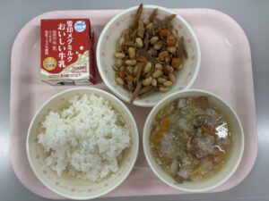 10月3日(金)の給食 今日の給食 2025.10.03 ごはん、牛乳、お豆の金平、肉団子のスープ煮 肉団子のスープ煮に入っている肉団子は、調理員さんの手作りです。ひき肉に玉ねぎ、生姜、調味料を入れてこね、一口サイズに丸めます。玉ねぎの水分がでることでふんわりとやわらかい肉団子に仕上がります。 Post Views: 92
