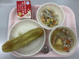 10月8日(水)の給食 今日の給食 2025.10.08 抹茶揚げパン、牛乳、ごぼうサラダ、ポトフ 給食で人気メニューのひとつ、揚げパンにはいろいろな味があります。きなこパンや抹茶揚げパン、ココア揚げパンなどが給食に出てきます。抹茶だけでは苦いので、今日はきなこと砂糖を抹茶に混ぜています。ほんのりお茶の香りがする揚げパンを味わってください。 Post Views: 55