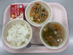 10月9日(木)の給食 今日の給食 2025.10.10 ごはん、牛乳、デジカルビ、ひよこ豆のスープ デジカルビは、韓国の料理です。デジは「ぶた」、カルビは「骨付き肉」という意味があります。骨付きの肉だと給食では食べにくいので、うす切りのぶた肉にしました。ぶた肉と野菜をみそやコチュジャンで甘辛く炒め、キムチでうま味をアップさせています。韓国のおもちのトッポギも入れました。 Post Views: 16