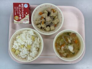 10月16日(木)の給食 今日の給食 2025.10.16 さつまいもごはん、牛乳、高野豆腐のふくめ煮、キャベツのみそ汁 高野豆腐は、豆腐を凍らせ、低い温度でねかせた後に乾燥して作る保存食です。乾燥していると、硬いスポンジのようですが、水で戻すと水を含んで重さは6倍にもなり、やわらかくなります。体を作るたんぱく質やカルシウム、貧血を防ぐ鉄分、お腹をきれいにする食物繊維など、豆腐の栄養がぎゅっと詰まっています。 Post Views: 51